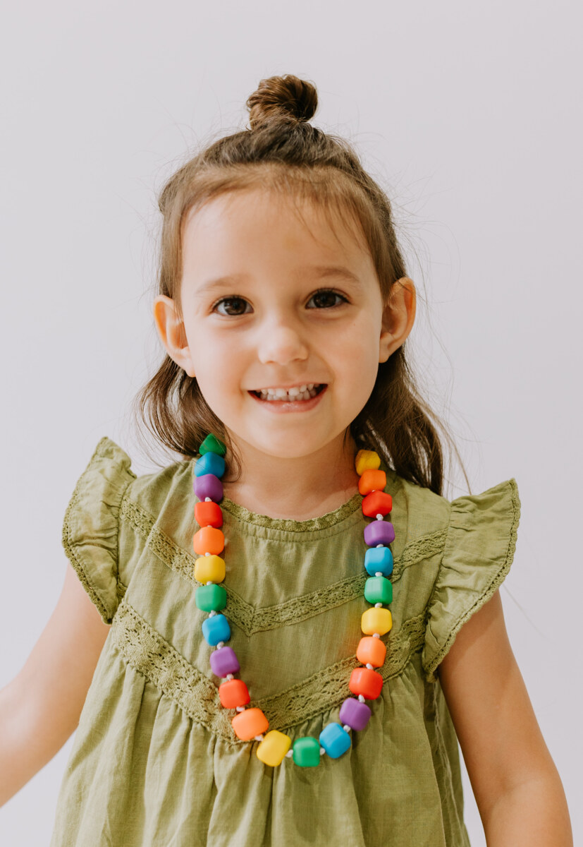 Medium – fast i tyggemotstand. Barna kan tygge på halskjedet i stedet for på andre ting. Sikkerhetslås. Mål: L53 cm. Mat næringsmiddelgodkjent silikon. Kan vaskes i varmt vann med såpe. PVC-fri. Fra 3 år. Selv om disse tyggeverktøyene er robuste og holdbare, er ingen tyggeverktøy uforgjengelige. De slites ut i ulikt tempo avhengig av hvordan de brukes. Overvåk barnet ved bruk, inspiser regelmessig halskjedet og kast det ved første tegn på slitasje.