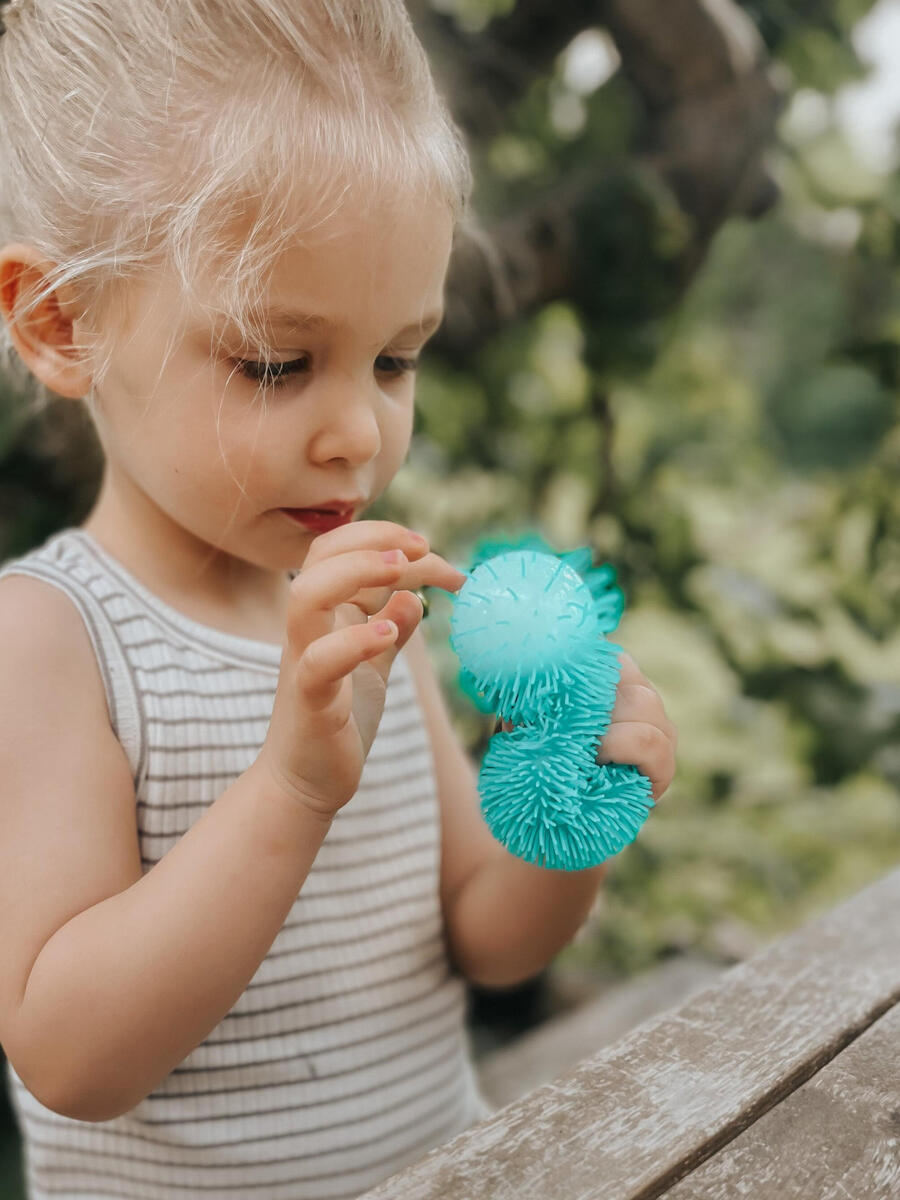 6 forskjellige fargede klemmeballer. Grip en ball og press, dytt eller klem den. Fylt med en giftfri, deiglignende masse som alltid går tilbake til sin opprinnelige form. Fra 3 år.
