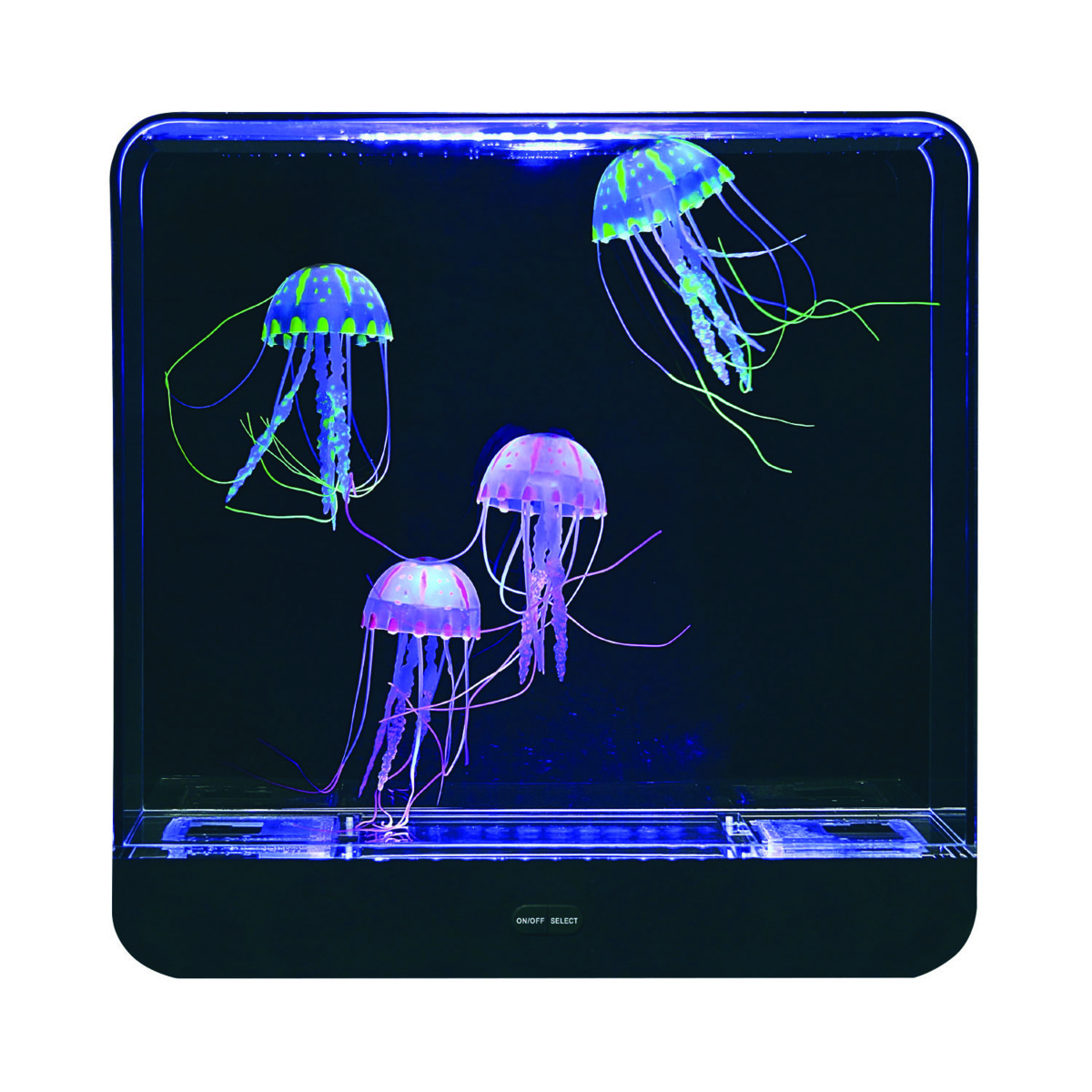 Et stort akvarium med fire kunstige maneter som «svømmer» rolig rundt. Det gir en følelse av ro å se på dem. Akvariet har en stillegående pumpe som driver manetene med luft. Fargene kan enten varieres eller stilles inn på en favorittfarge. Mål: 35x35x11,5 cm.