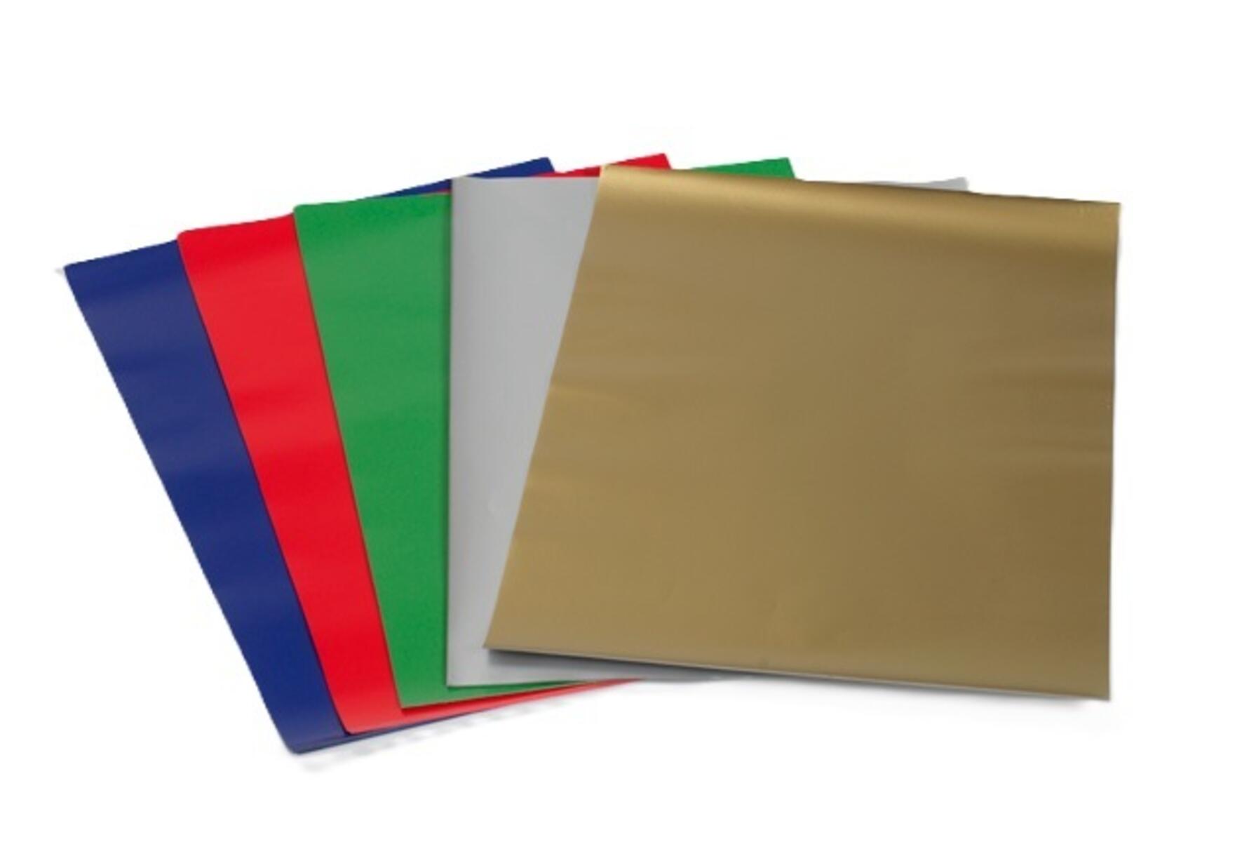 Glanspapir 25 x 35 cm, 5 farger x 10 ark. Rød, blå, grønn, gull og sølv. Klassisk gummiert papir. Den ene siden er farget, den andre hvit.