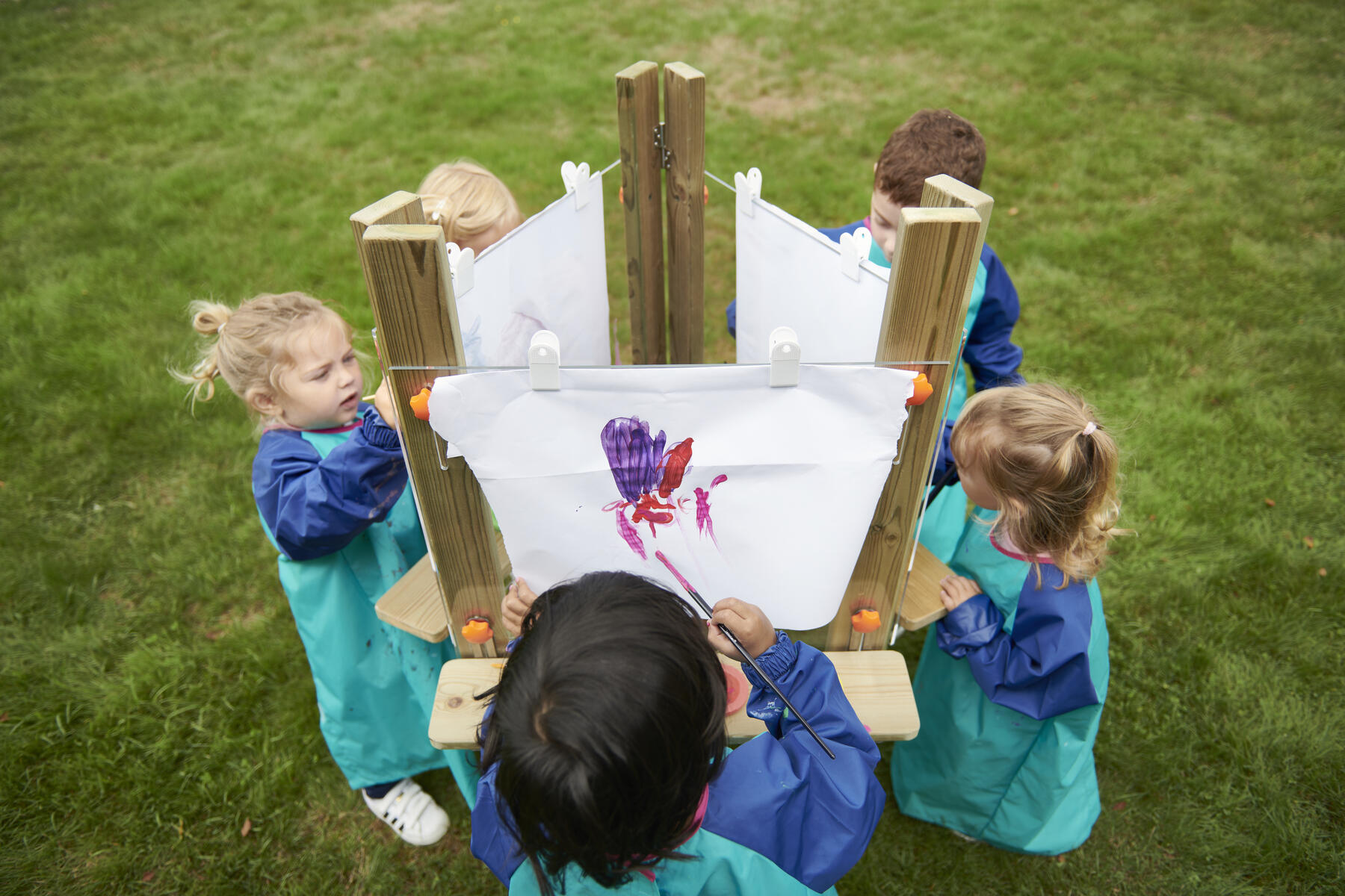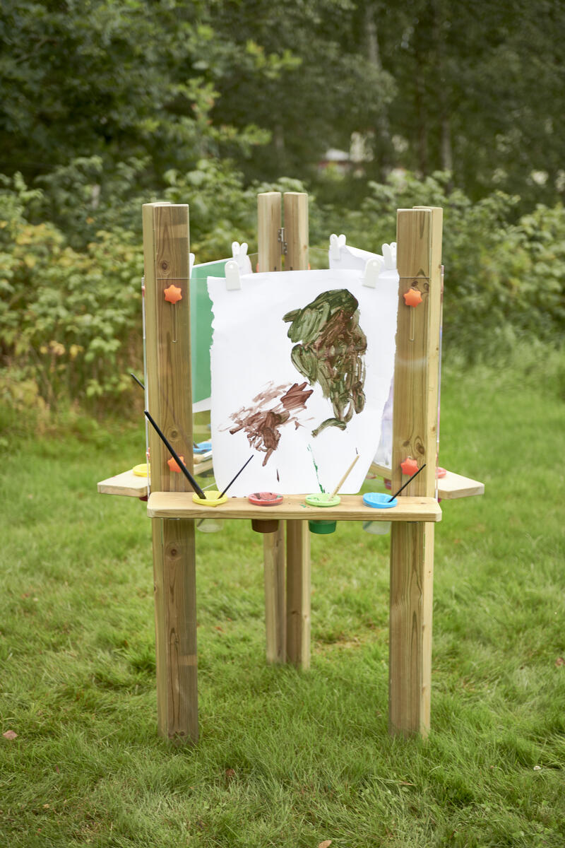 Robust dobbeltsidig staffeli for utendørs bruk. Gjennomsiktig panel av akrylplast, enkel å rengjøre. Den kan males direkte på panelet med vaskbar maling. Oppbevaringshylle med plass til malingsflasker, pensler etc. Mål: B85.5xH120xD67 cm. Arbeidsområde 77x55 cm. Leveres umontert. Monteringsanvisning inkludert. Laget av trebeskyttelsesbehandlet furu. FSC-merket.