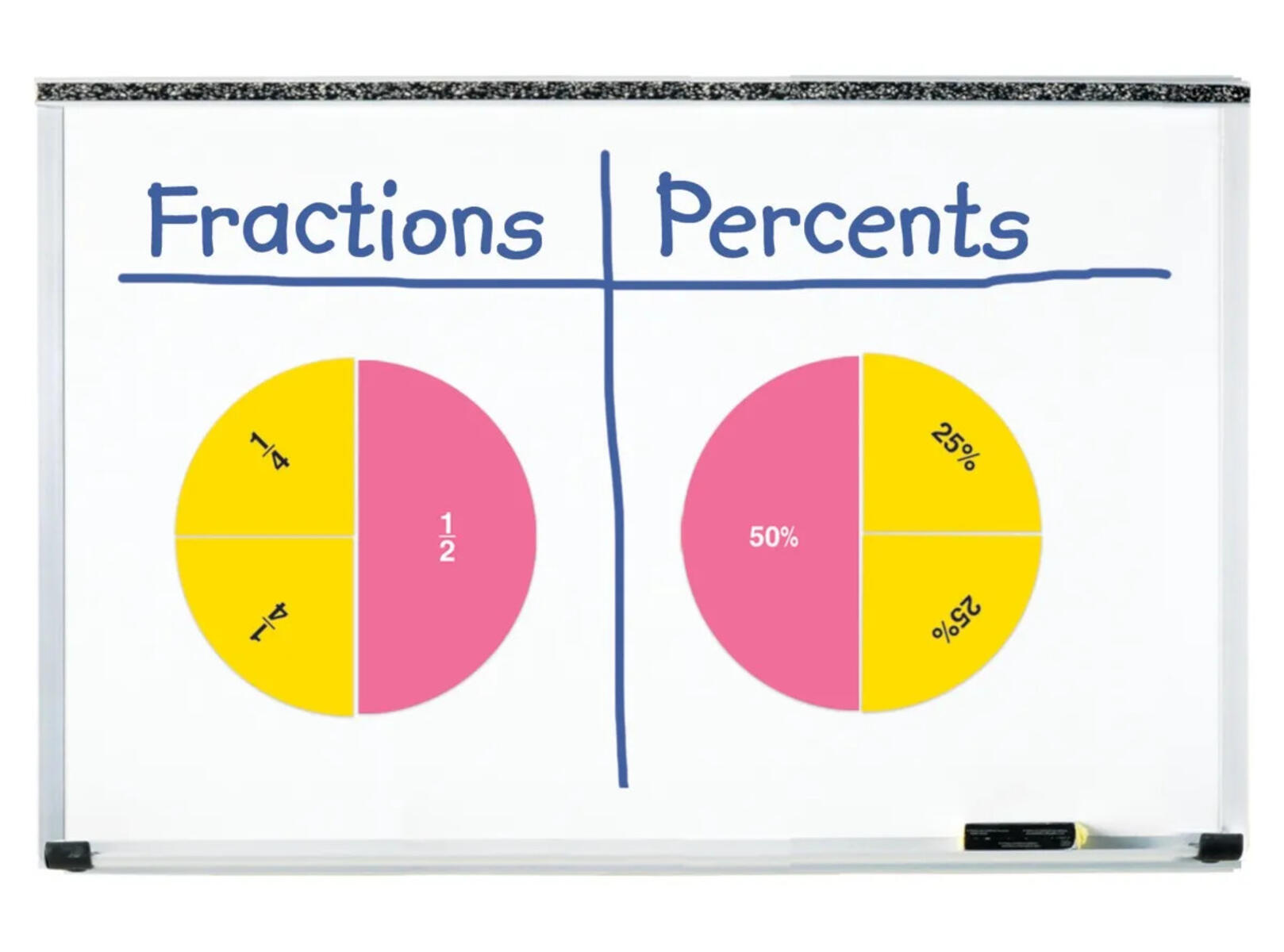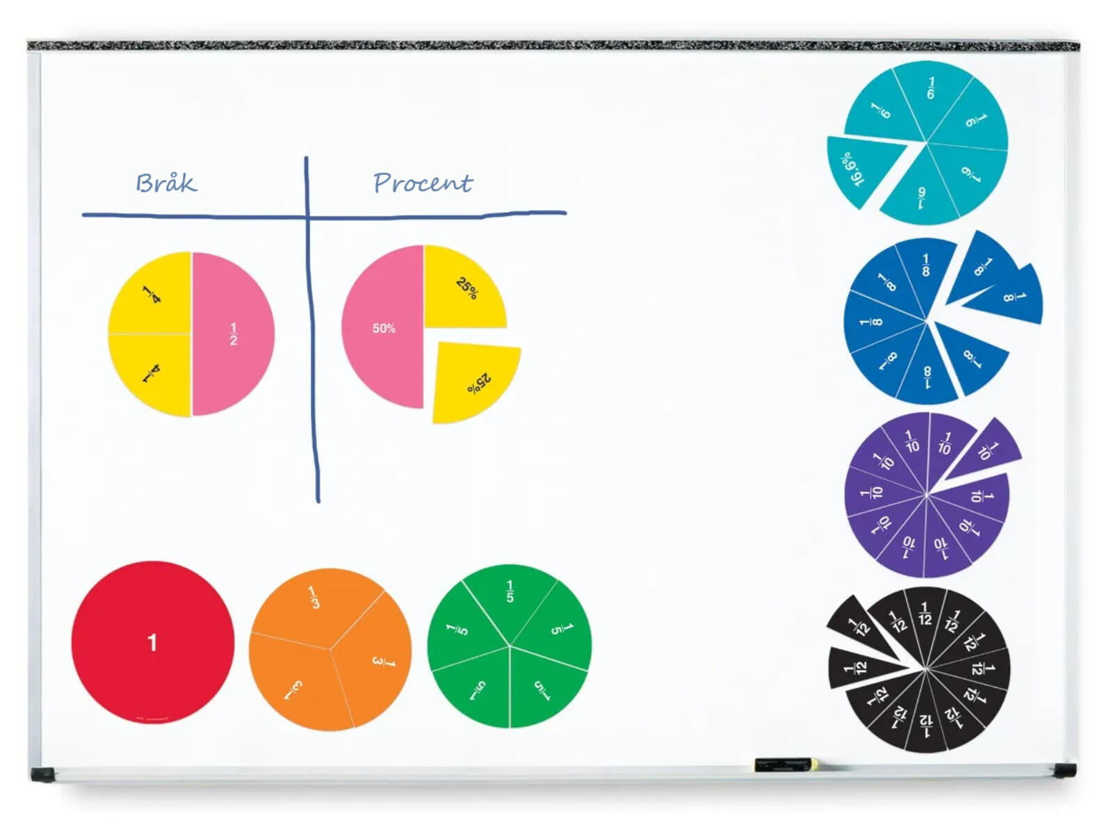 La elevene samarbeide med disse dobbeltsidige magnetiske brøksirklene. Fargekodede magneter. Sett sammen fraksjoner og snu på brikkene for å se prosentsatsen. Alder 6+.