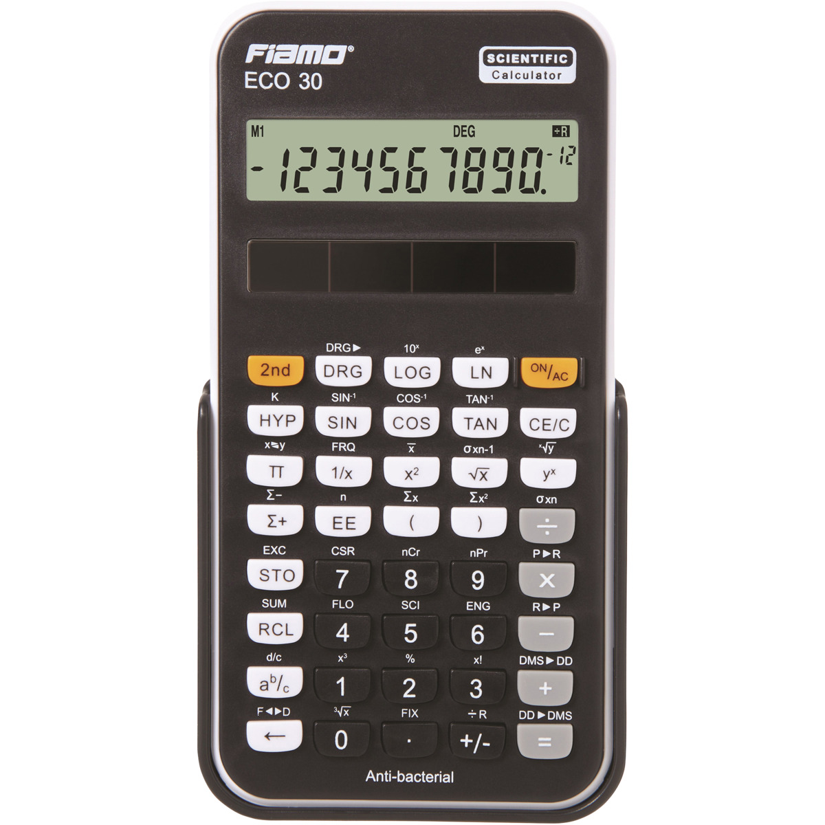 En vitenskapelig kalkulator med antibakteriell overflate og solcelledrift – perfekt for skoler og kontorer der mange deler utstyr. Den er laget av resirkulert plast og tilbyr 138 funksjoner, inkludert logaritmer, trigonometri, statistikk og brøkregning. Med sin tydelige LCD-skjerm og brukervennlige design passer den både til grunnleggende og avanserte beregninger.