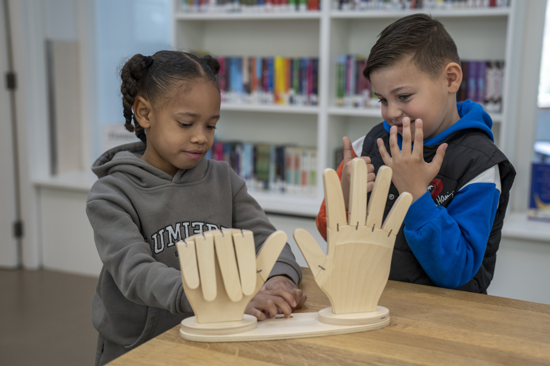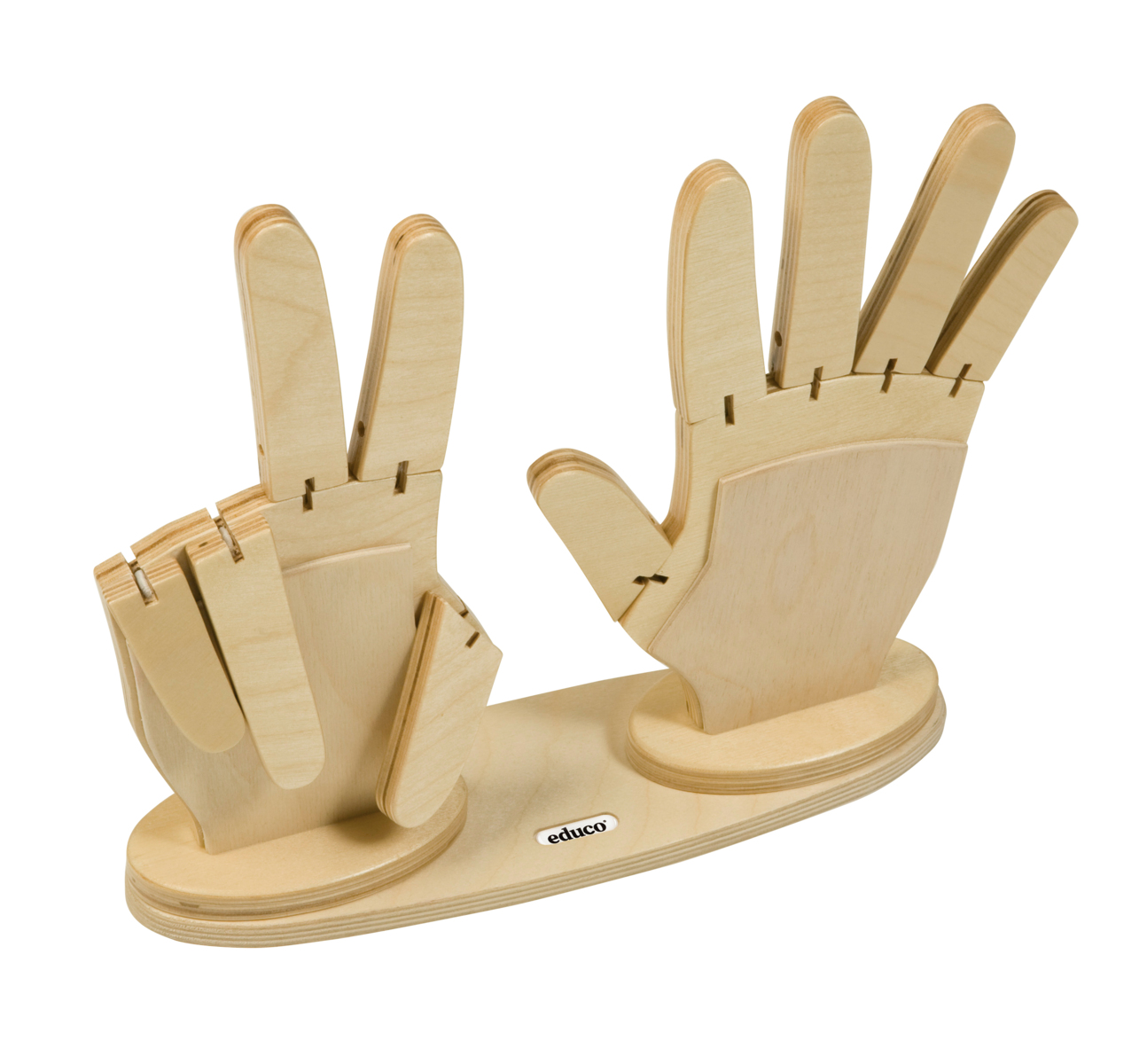 2 store slitesterke trehender med bøyelige fingre. Hendene er fast montert på en trebase. Bruk for å vise og telle med mengdene 0-10. Manual på engelsk inkludert. Fra 3 år.