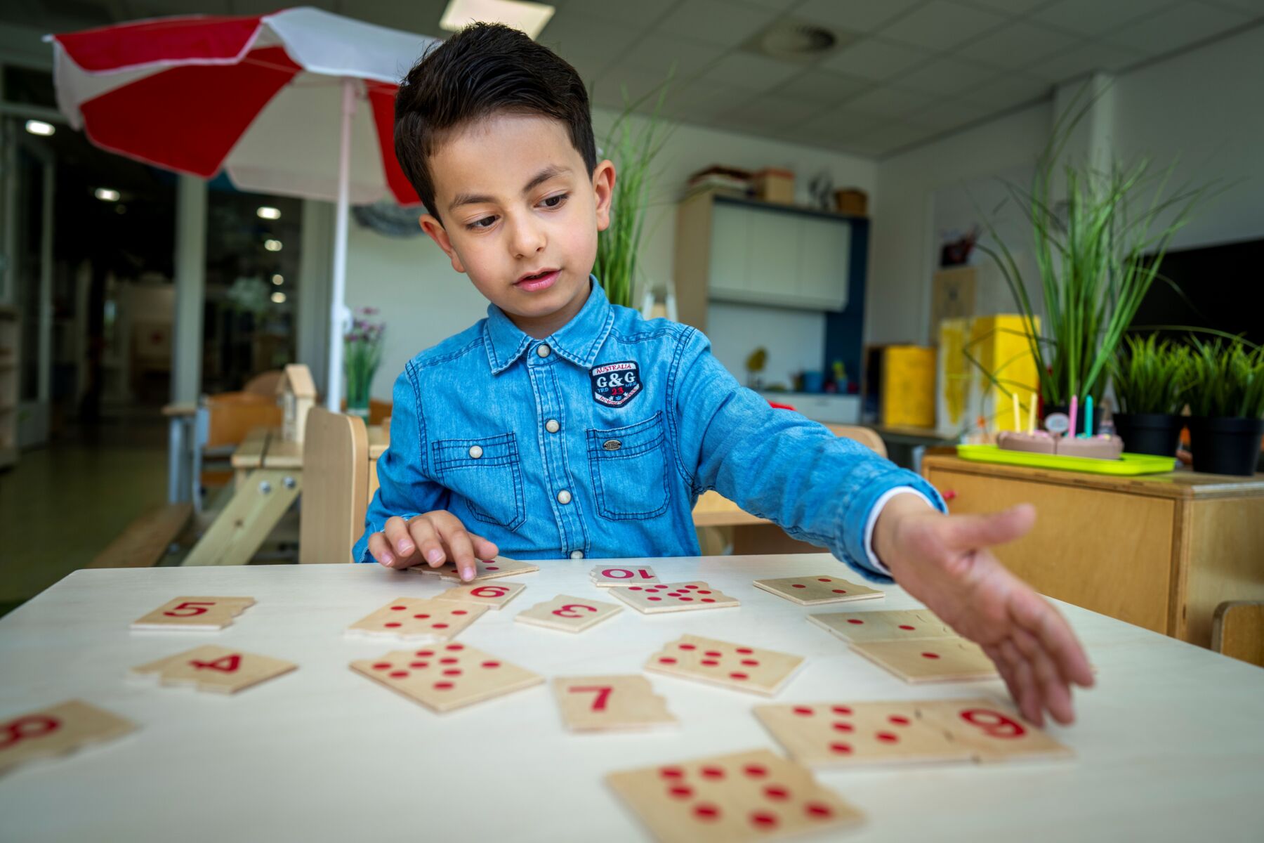 20 puslespillbrikker i tre som matcher 2 og 2 sammen og treboks til oppbevaring. Introduserer tydelig og konkret mengde med det skriftlige tallet. Tell prikkene og match med et tallsymbol. Sjekk svarene ved å matche puslespillbrikkene. Selvkorrigerende. Mål: puslespillbrikker 18,5x9,5 cm, treboks 24x12,5x7 cm. Fra 3 år.