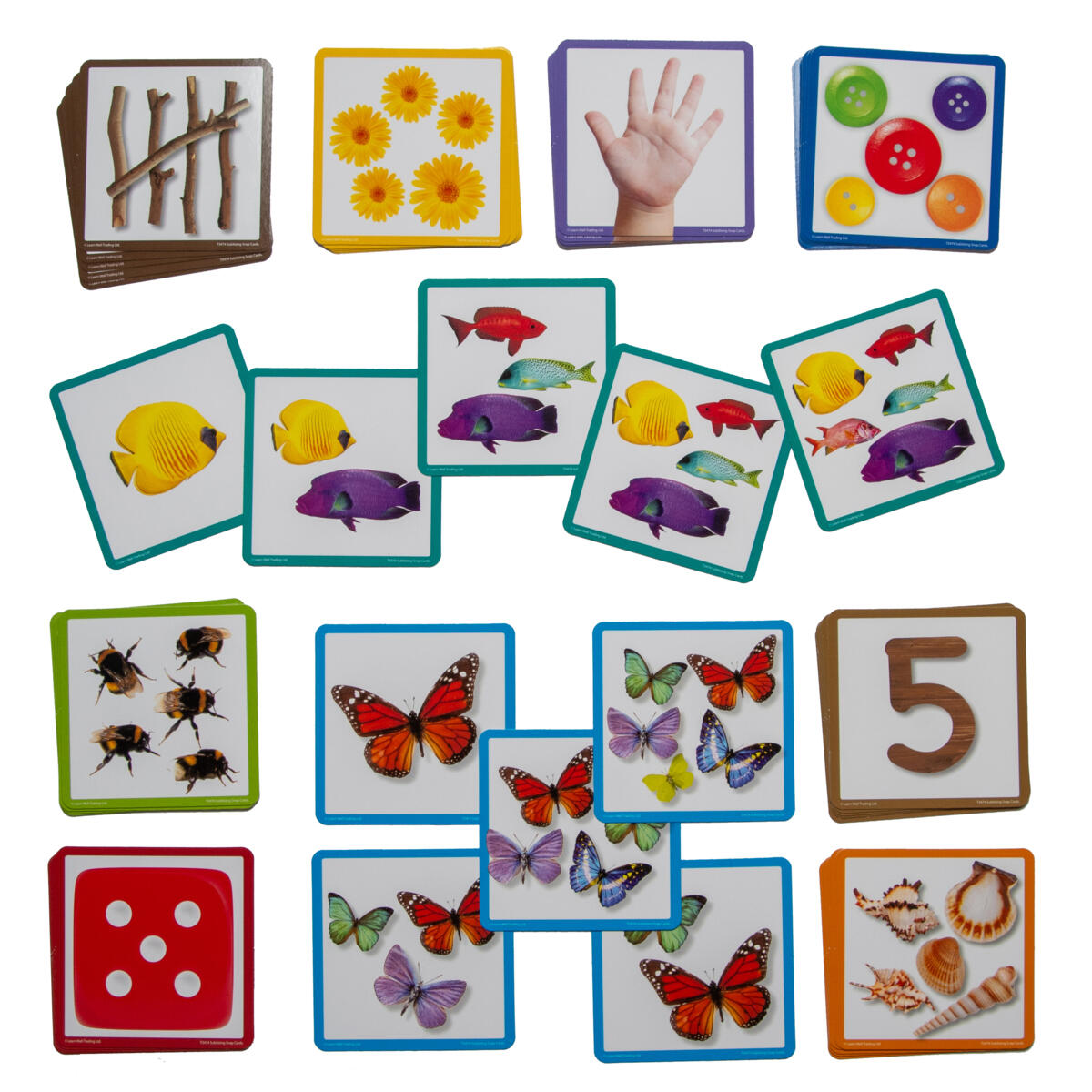 Dette enkle spillet bygger barns selvtillit til til tall. Når de spiller kortet sitt, vil de raskt begynne å "se" i stedet for å telle om kortet deres har samme mengde som det forrige kortet. Hver mengde opptil fem vises som tall, tilfeldige prikker, bier, knapper, fingre, blomster, fisk, pinner og skjell. 50 kort i settet pluss et instruksjonskort. Hvert kort måler 98x98 mm.
