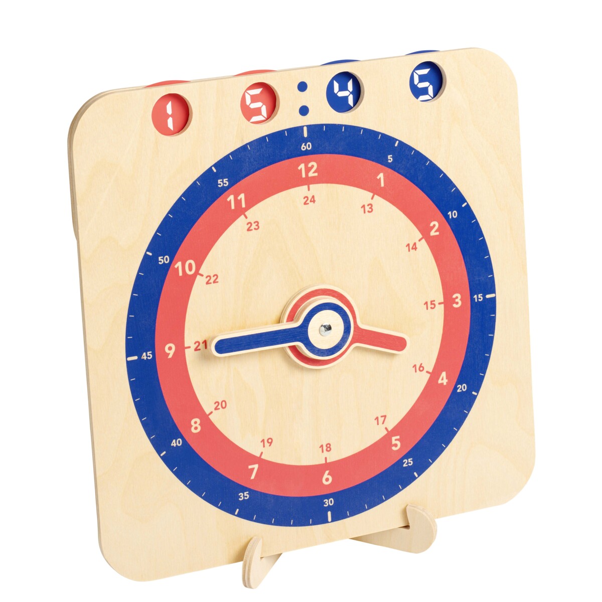 Stor klokke av tre med 12 og 24 timers markører og digitalt display. Still inn tiden på den analoge klokken med time- og minuttviserne og vri tallene for den tilsvarende digitale tiden. Mål: 28,5x28,5 cm.
