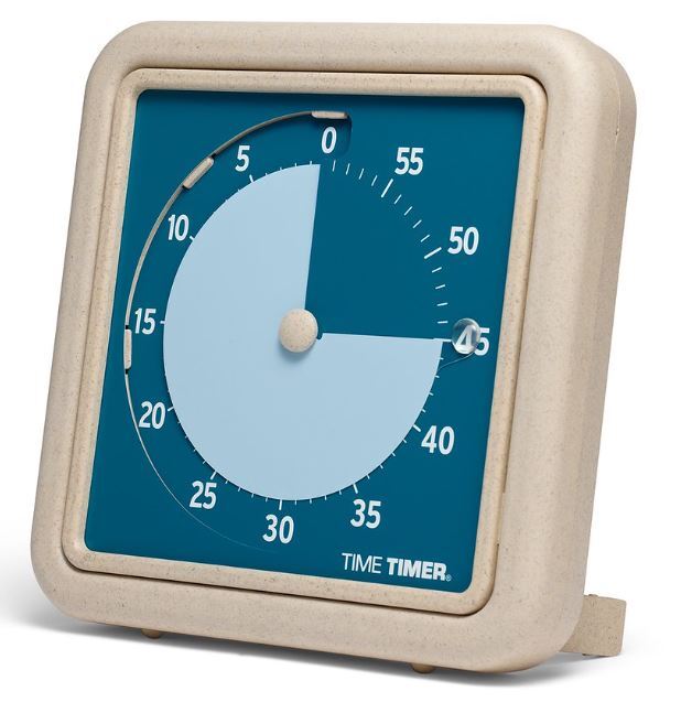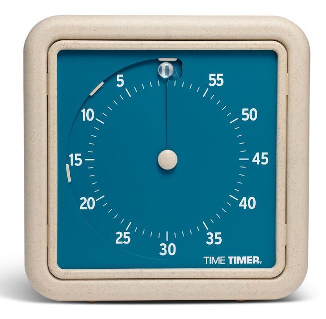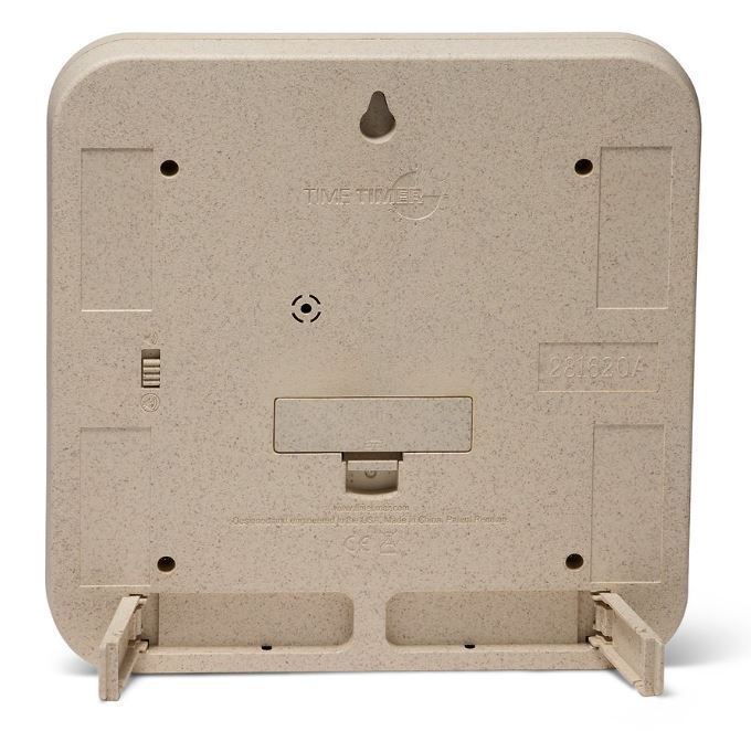 Time Timeren holder styr på tiden både individuelt og i gruppe. Denne versjonen er laget av 50 % mindre plast. Kan stå på bord eller henges på vegg. Lydløs nedtelling. På/av-knapp for alarm på baksiden. Drives av 1 stk AA/1,5 V-batteri (ikke inkludert). Mål: 19x19 cm.