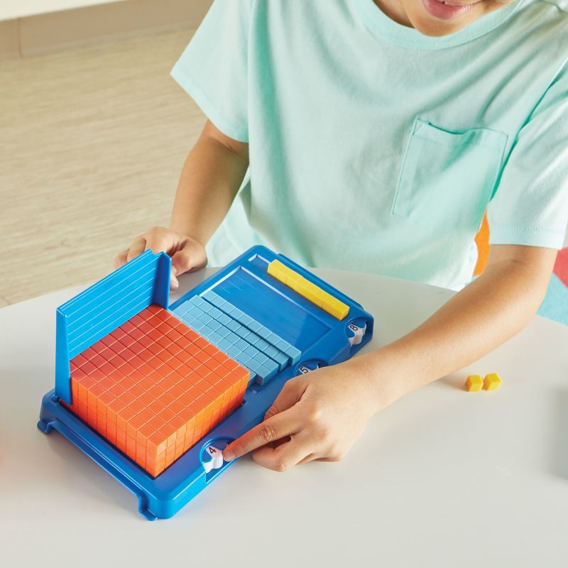 En tydelig og konkret modell for å øve på enere, tiere og hundrere. Stativet er utformet med tallhjul for å endre verdien avhengig av hva som er plassert på hver posisjon. Det følger med 10 hundreplater, 10 titallsstaver og 10 enerkuber. Mål: 25×14×12 cm. Materiale: ABS og HIPS. Fra 3 år.