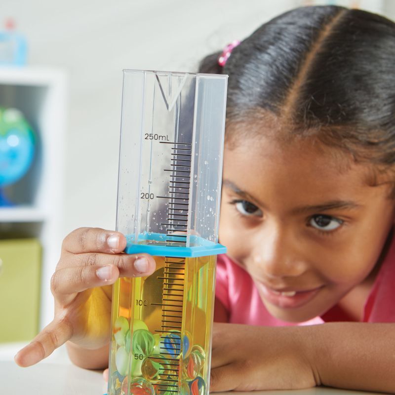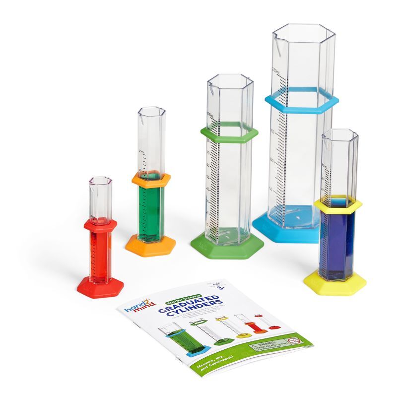 5 stk. Graderte målesylindere med helletut (10, 25, 50, 100, 250 ml). Hell, mål og utforsk. Klar, slitesterk plast med en krage som kan skyves opp og ned for å holde oversikt over nivåene. Høyde: 10,5 / 13,5 / 14 / 16 / 19 cm. Fra 3 år.