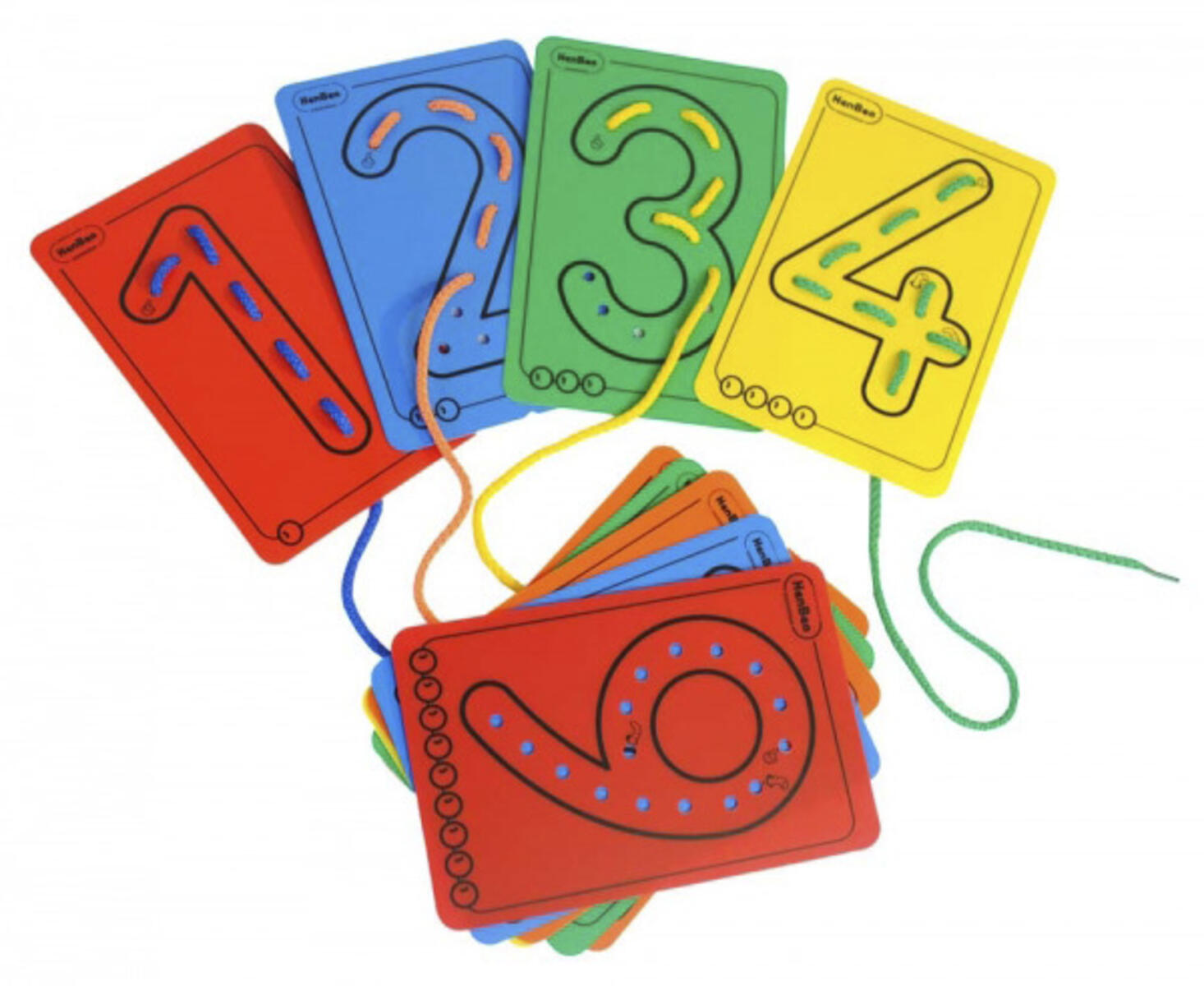 10 stk/pk. Øv på finmotorikk ved å tre snoren gjennom hullene og bli kjent med tallene samtidig. Hvert kort har også et bilde av det matchende antall perler. Settet inneholder 10 plastkort og 10 snorer. Mål: 16,5x11 cm. Av PP. Fra 3 år.