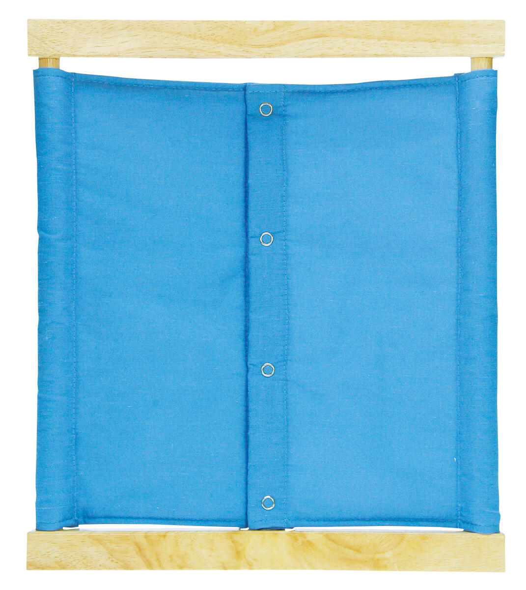Med mål om å kunne kle på seg selv trener barna her på å koordinere sine bevegelser, konsentrasjon og selvstendighet. Stoffet kan tas av rammen. Håndvaskes. Mål: 29,5x29,5 cm.