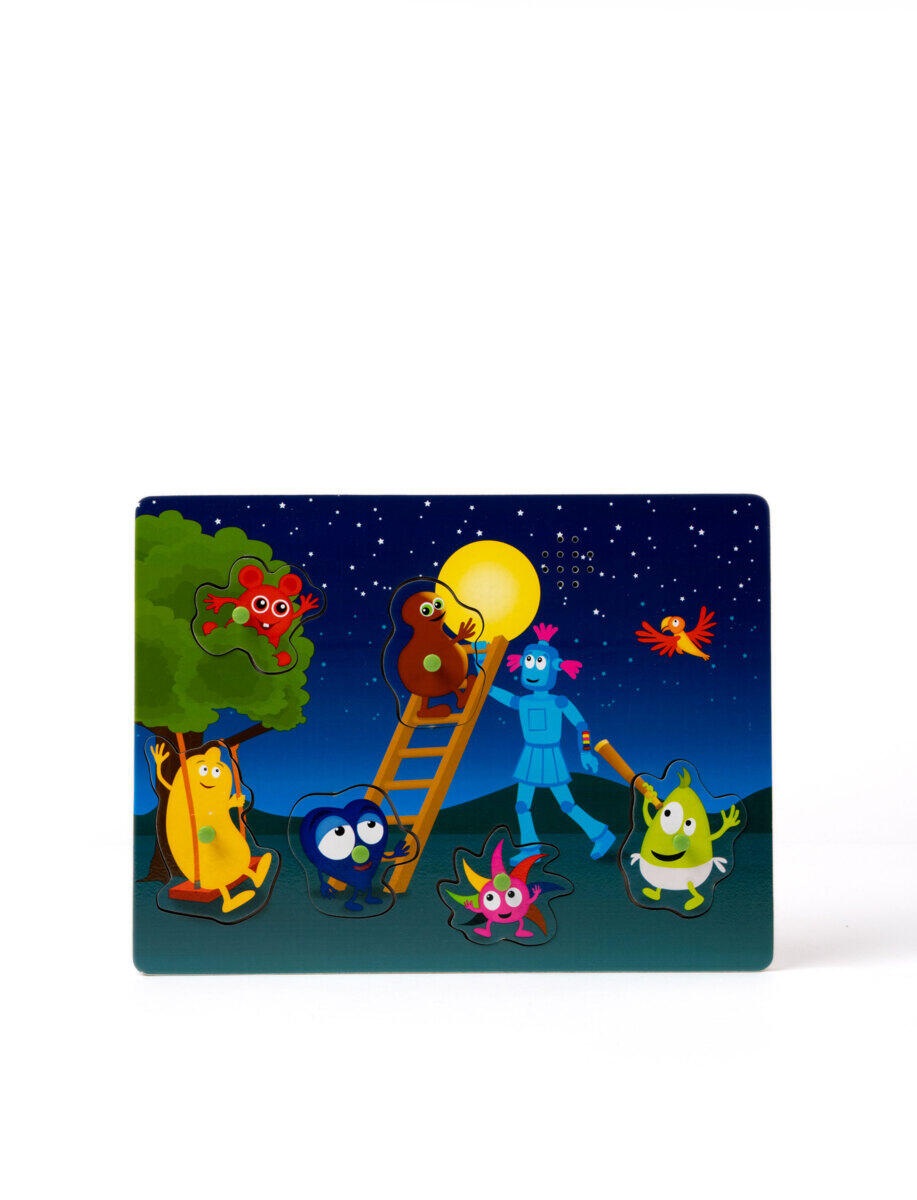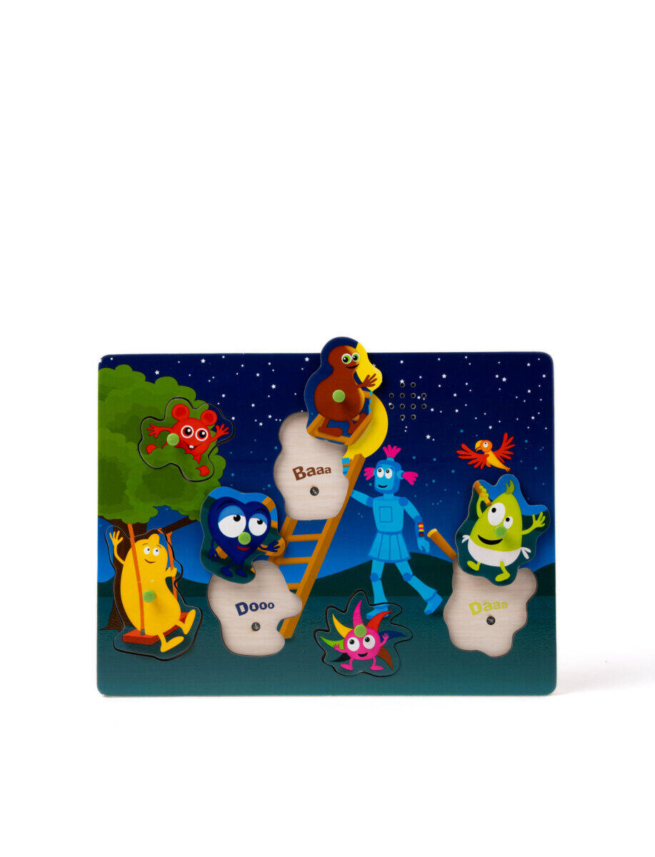 Babblarnas lydpuslespill hjelper barnet med å øve på lyder. Når puslespillbiten plasseres riktig, høres Babblarens lyd, for eksempel: "Diddi, diddi, diddi!" På denne måten får barnet både visuell og auditiv tilbakemelding i språktreningen. Mål: 30 x 22,5 cm. Krever 2 AAA-batterier (ikke inkludert). Det finnes en av/på-bryter på baksiden, slik at puslespillet også kan brukes som et vanlig puslespill. Laget av lindetre. Fra 10 måneder.