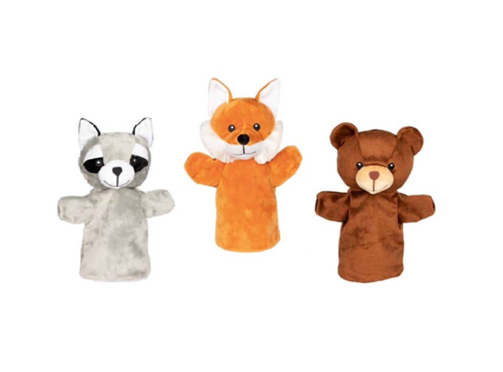 Myke hånddukker som hjelper barna med å kommunisere, fantasere og skape historier. En vaskebjørn, en rev og en bjørn presenteres i dette settet. Mål: 22–24 cm. Fra 1 år.