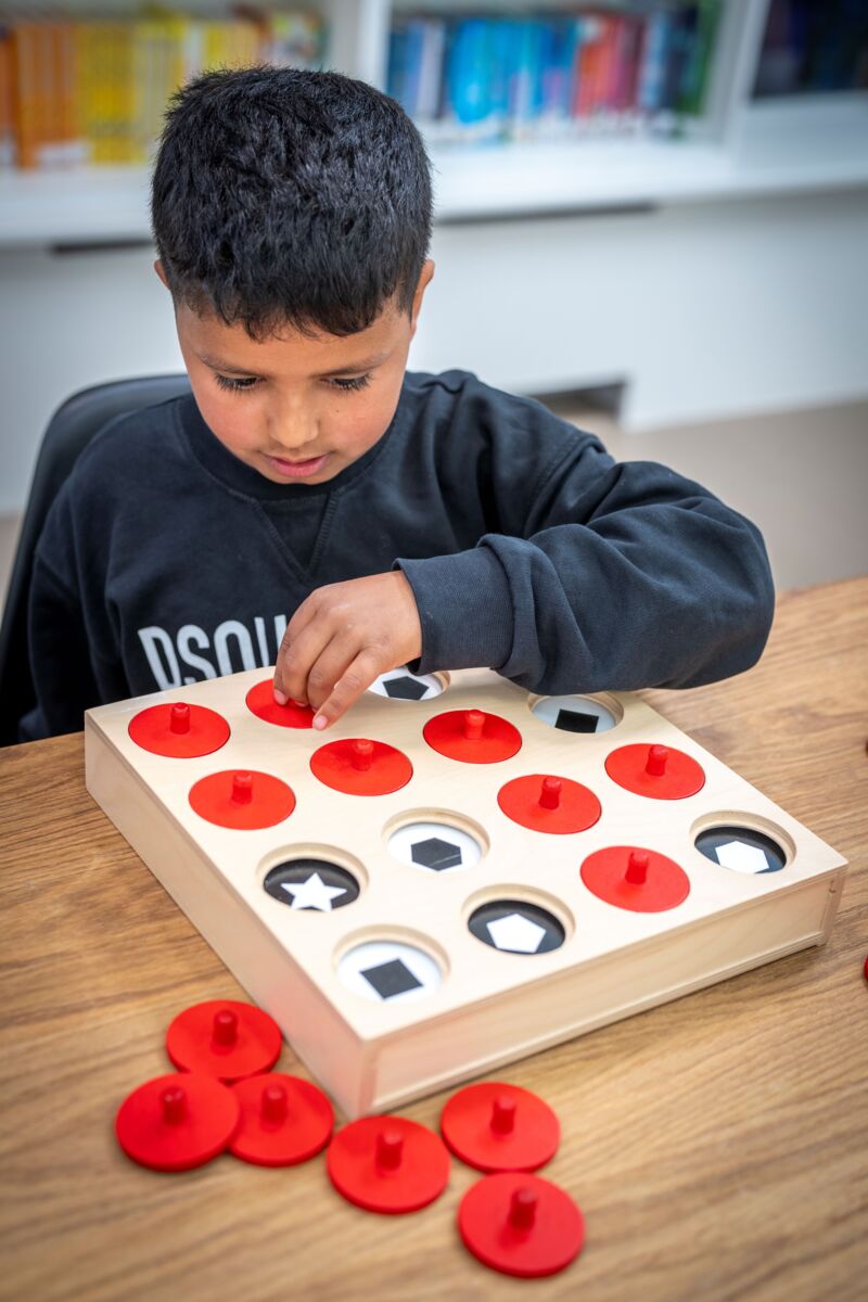 8 oppgavekort i plast, 16 røde tresirkler med knott, spillebrett/oppbevaring av tre. Sett inn et oppgavekort i den øverste hyllen på spillebrettet og prøv å finne parene ved å løfte de røde sirklene. Utvikle øye-hånd-koordinasjon, romlig persepsjon og evnen til å skille detaljer. Mål på spillebrett: 32x32x6 cm. Fra 3 år.