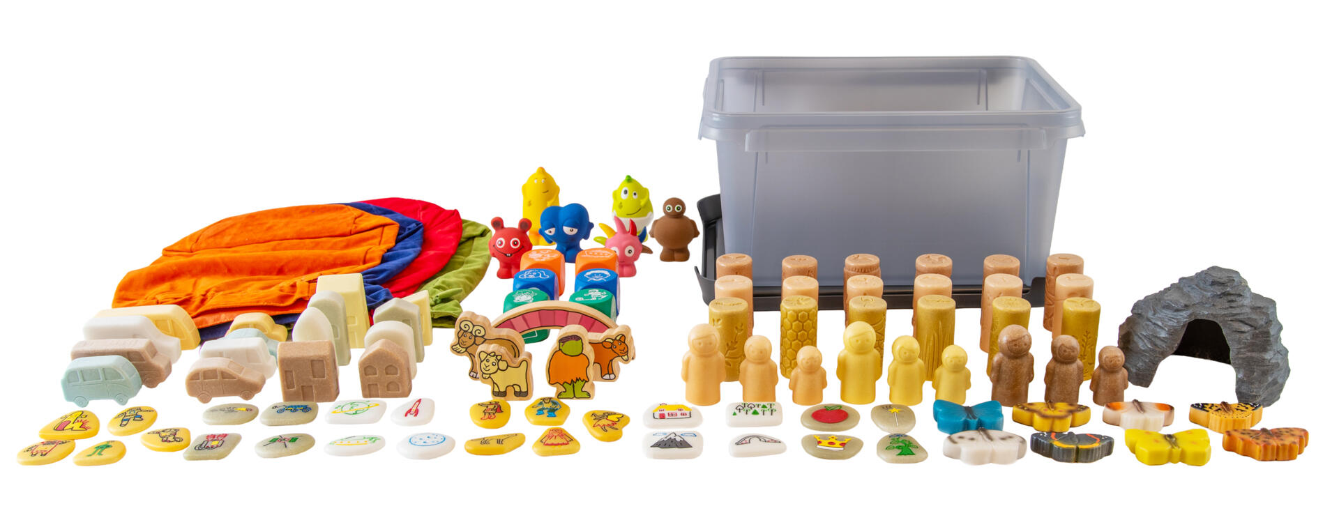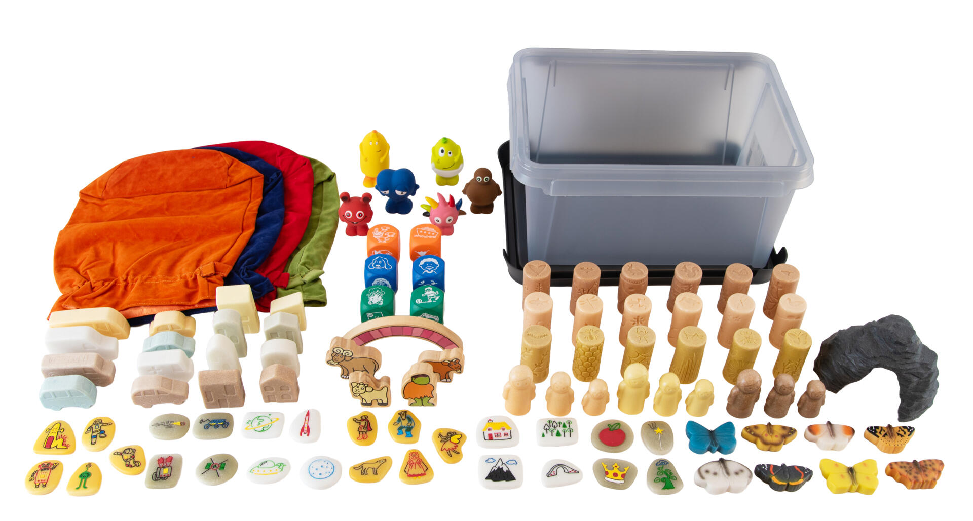 113 deler. Et stort sett full av ting for å jobbe med fortelling utendørs. Slitesterke biler, hus, dyr og figurer som du bygger eventyrverdener med i både sol og regn. Med eventyrsteinene skapes et eventyr lettere ettersom barna får hjelp til ulike deler av historien. Den populære historien om Bukkene Bruse gjøres best utendørs. Med hjulene lager vi også en scene for ulike historier – rull dem i våt sand og stemple figurer og bygg historien sammen. Babblarna er også med og kan brukes i snø, regn og sol. Alt kan oppbevares i fløyelsposene og den værbestandige oppbevaringsboksen. PVC-fri.