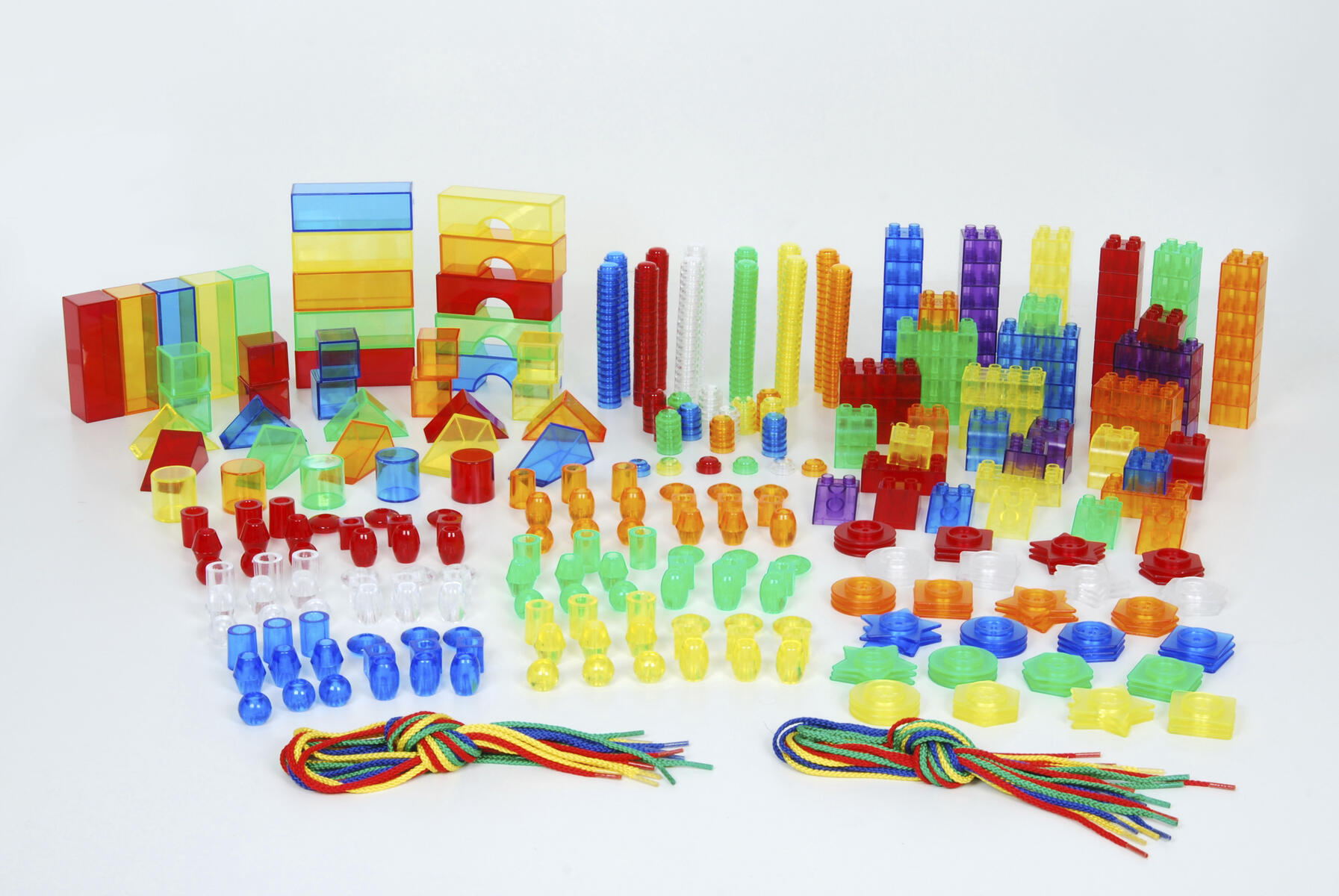 Et sett med ca 500 transparente matematiske former og snorer i akrylfarger. Brukes på et lyspanel for å utforske matematiske emner som form, telling, sortering, mønster og rekkefølge. Utvikler finmotorikk og inspirerer til kreativ lek. Inneholder praktisk oppbevaringskasse og aktivitetsguide.