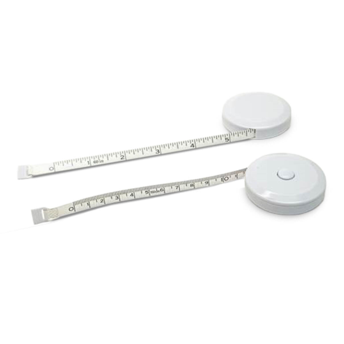 Målebånd med cm/tommer. Lengde 150 cm, bredde 7,5 mm. Bånd av TPR, plasthus av ABS. PVC‑fritt.