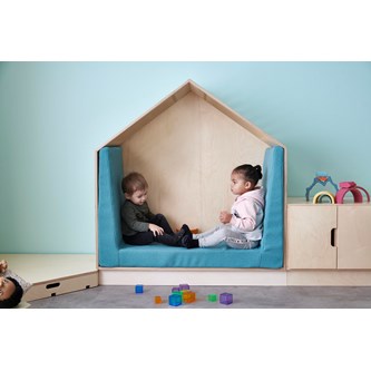 Hus i kryssfiner som blir et eget "hus-i-rommet". Tre hele vegger og tak med hull. Man kan sitte i fred og ro i egne tanker - alene, men likevel i rommet. Som madrass i huset kan vi anbefale art nr 80550 stellebordmadrass. Klarlakkert. Mål: 87x87x100 cm