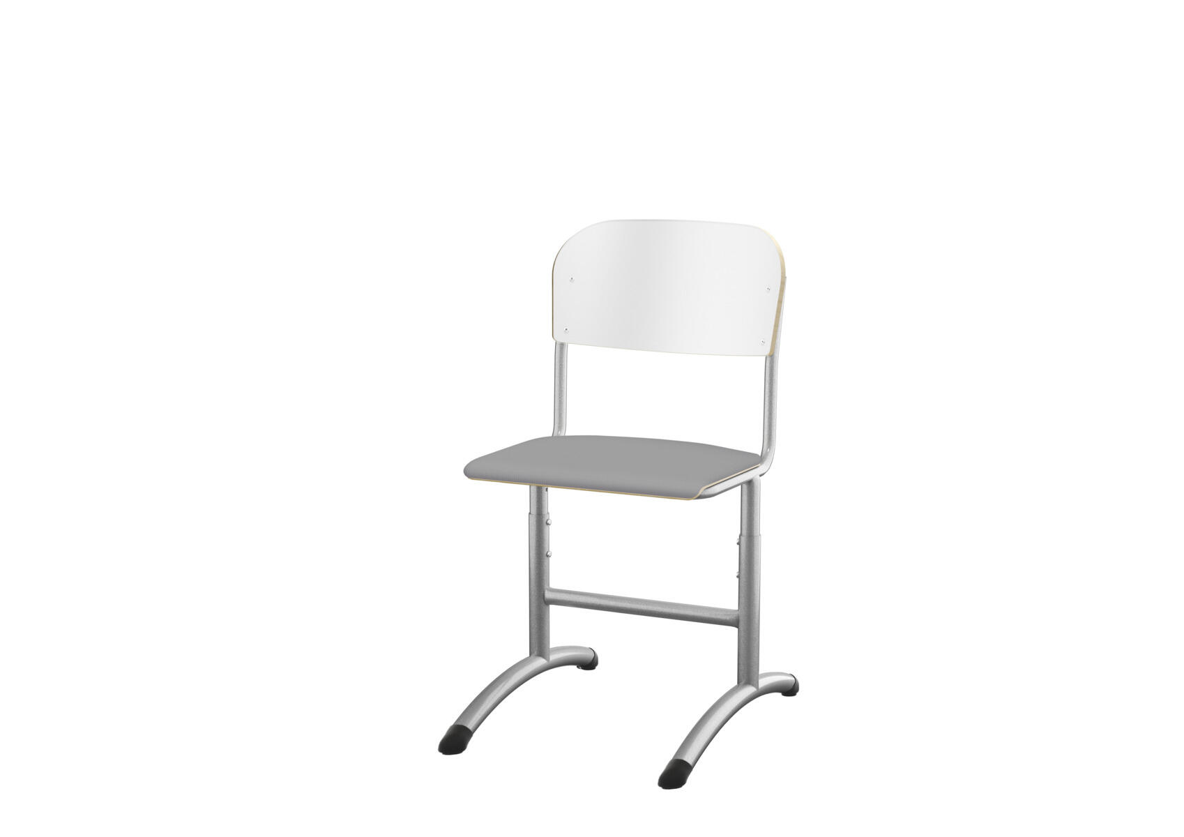 Justerbare føtter. Sete og rygg i høytrykkslaminat. Epoxylakkert understell hvit RAL 9003. Justerbar sittehøyde 38, 43, 46 eller 51 cm. Setemål: 42x39 cm. Vekt 5 kg