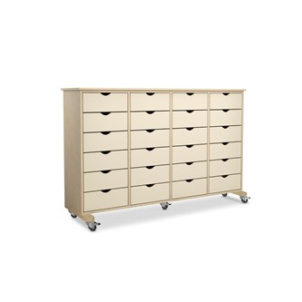 Kjøpmannsdisk/kommode av 18 mm klarlakkert bjørk kryssfiner. Leveres med 5 hjul, 4 på støtteben. 24 skuffer på ekspansjonsskinner. Mål: 113x37x100 cm. Innvendig mål pr skuff: 21x32 cm. Støttebenet stikker ut ca 7 cm. Mobile enheter gir økt fleksibilitet mulighet for å forandre rommets møblering. Vi vil gjøre oppmerksom på at hyller og seksjoner på hjul gir en økt risiko for å tippe, spesielt hvis de plasseres fritt på gulvet. Unngå å plassere tunge gjenstander høyt oppe og ikke la barn flytte hyllen. For mobile enheter med høyde over 1 m anbefaler vi å plasseres de mot vegg.