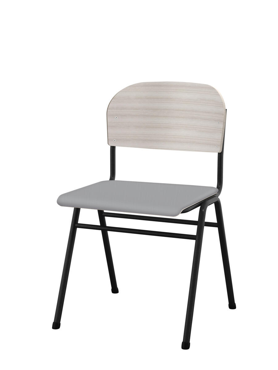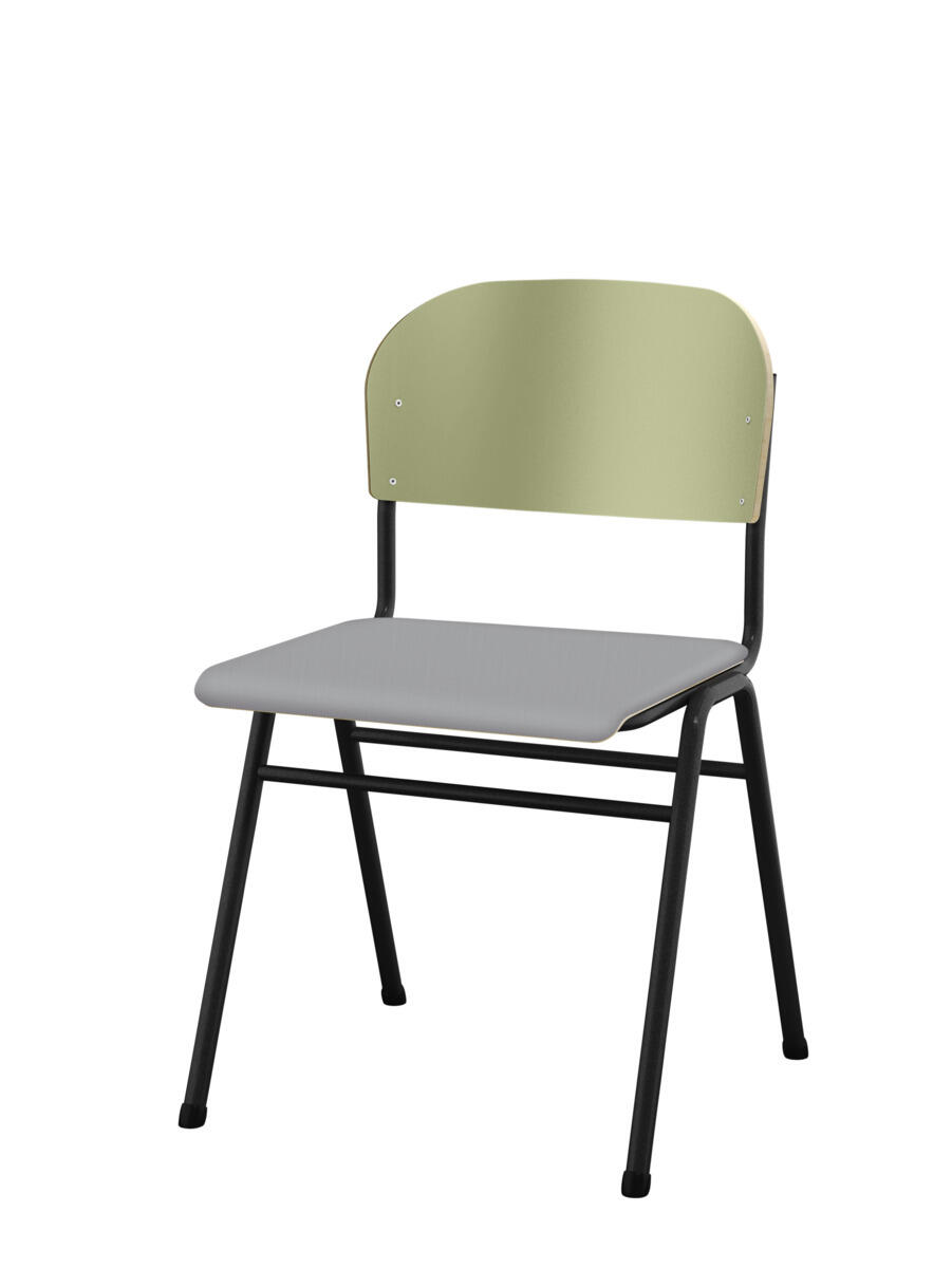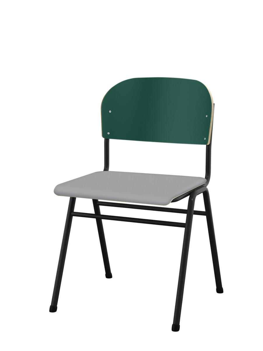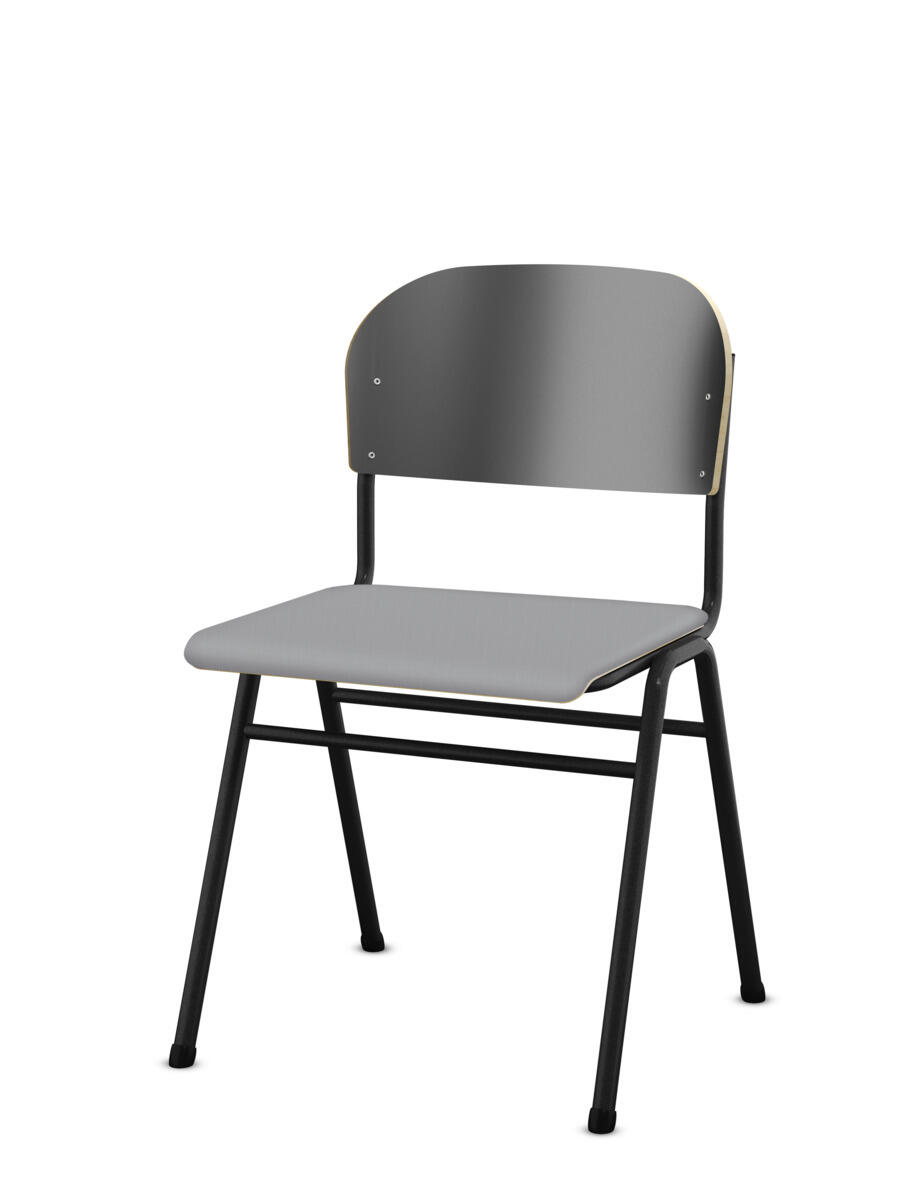 Plastskall av 100% resirkulert materiale. Stolen oppfyller EN 1729-1Sizemark 5-6 som innebærer at brukere mellom 146 og 188 cm sitter bekvemt og ergonomisk riktig. Veskekrok på baksiden. Kan stables. Kan henges opp hvis stolen snus. Enkel å gjøre ren. Svart understell RAL 9005. Sittehøyde 45 cm, setebredde 42 cm, setedybde 40 cm. Kledd sete i 100% resirkulert materiale.