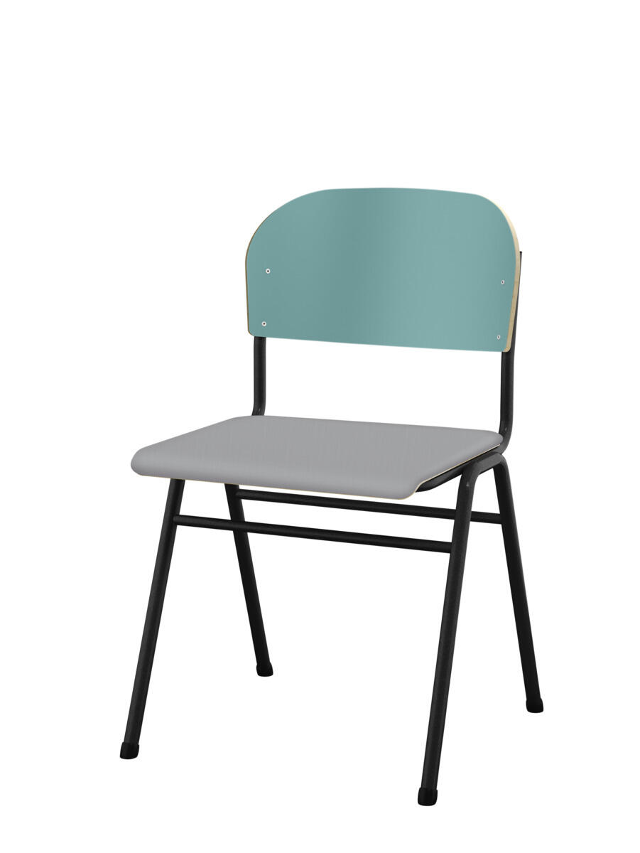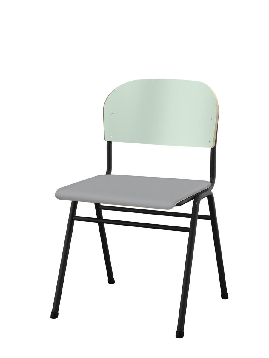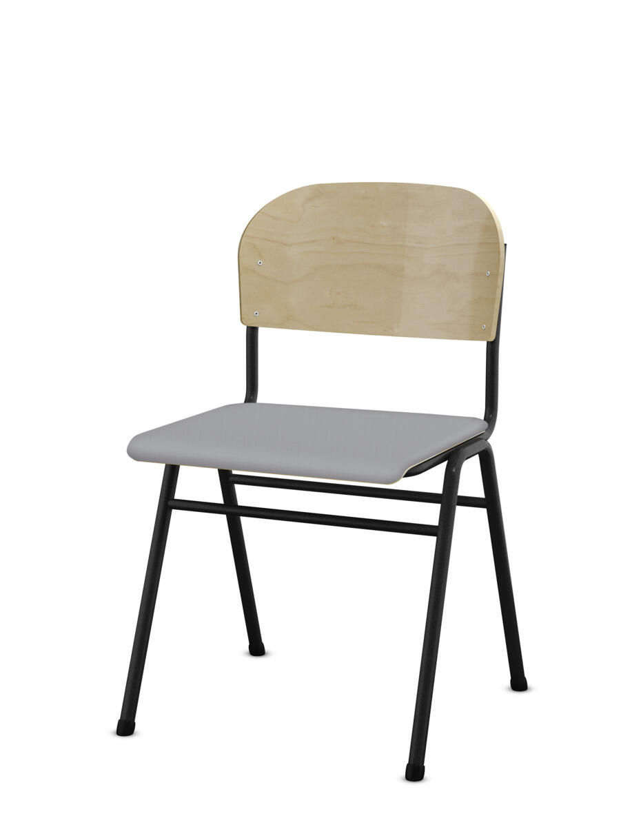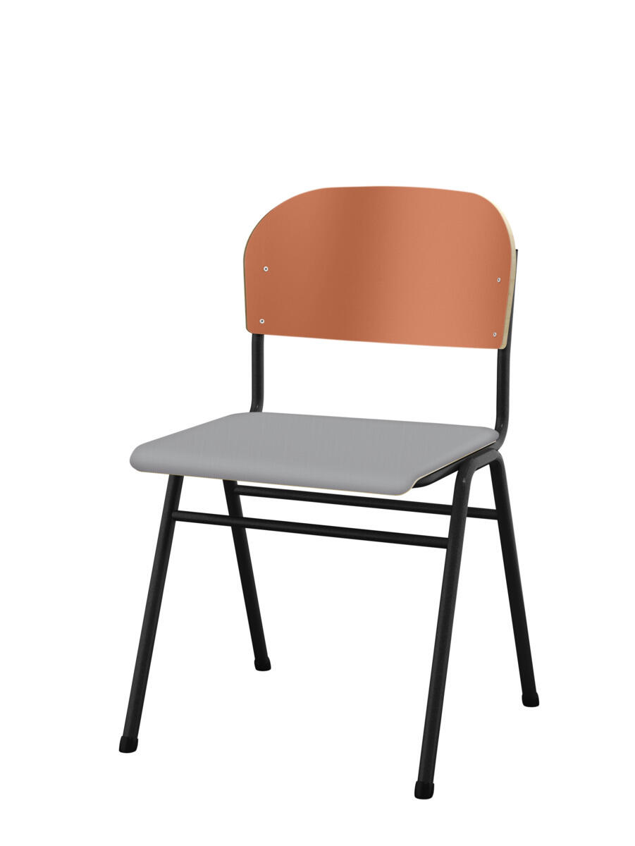 Plastskall av 100% resirkulert materiale. Stolen oppfyller EN 1729-1Sizemark 5-6 som innebærer at brukere mellom 146 og 188 cm sitter bekvemt og ergonomisk riktig. Veskekrok på baksiden. Kan stables. Kan henges opp hvis stolen snus. Enkel å gjøre ren. Svart understell RAL 9005. Sittehøyde 45 cm, setebredde 42 cm, setedybde 40 cm. Kledd sete i 100% resirkulert materiale.