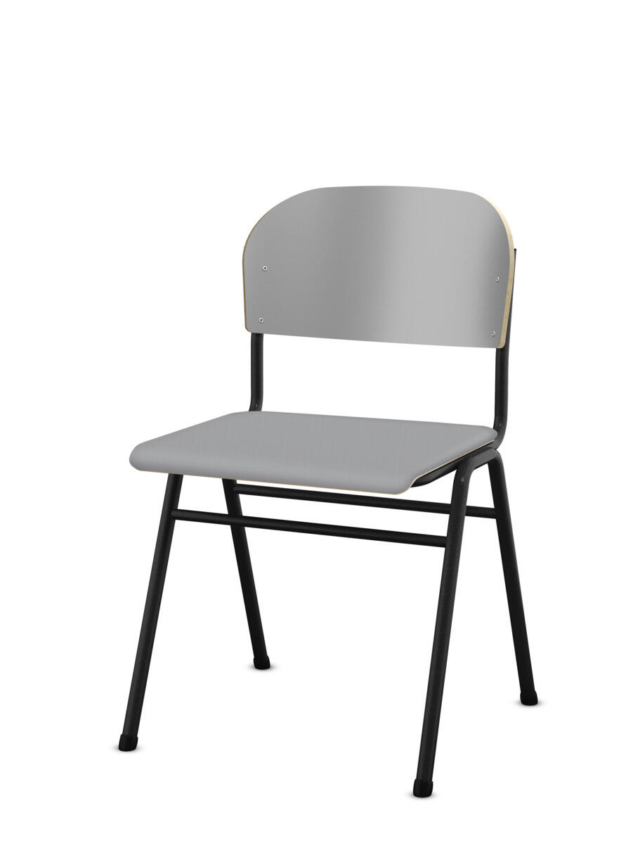 Sete og rygg i høytrykkslaminat. Epoxylakkert understell i sølv RAL 9006. Sittemål (bxdxh) 42x39x45 cm. Totaldybde 54 cm. Vekt 5,8 kg. Kan stables maks 4 i høyden. Støydempende føtter. Kan henges på bord.