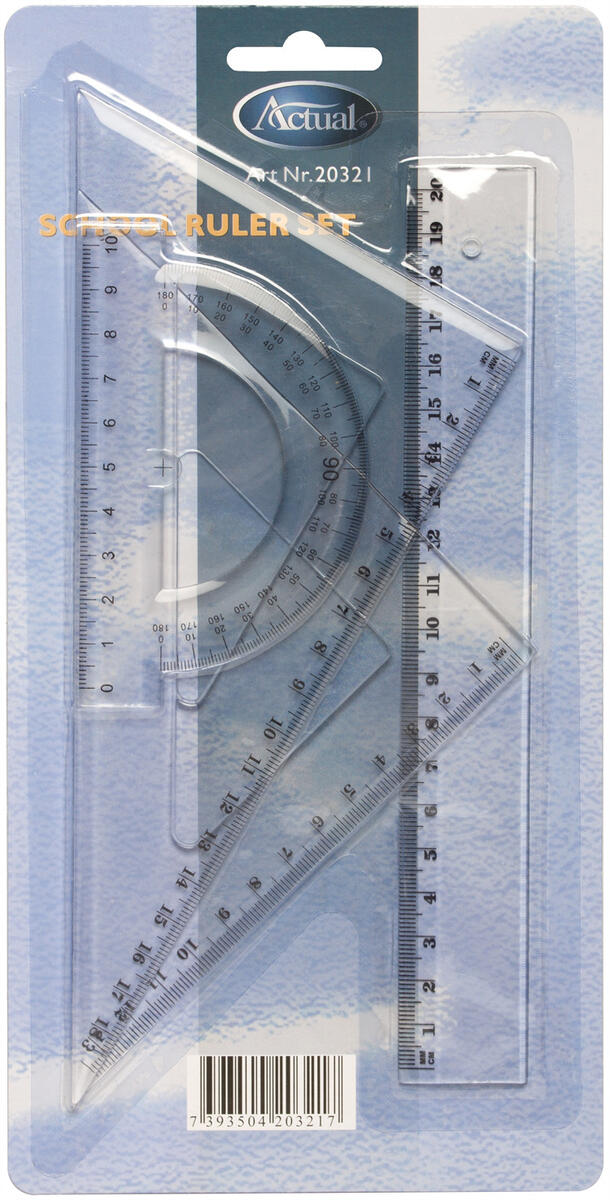 Settet inneholder en linjal på 20 cm, to vinkelhaker – én på 60° og én på 45° – samt en gradskive på 180° (10 cm).