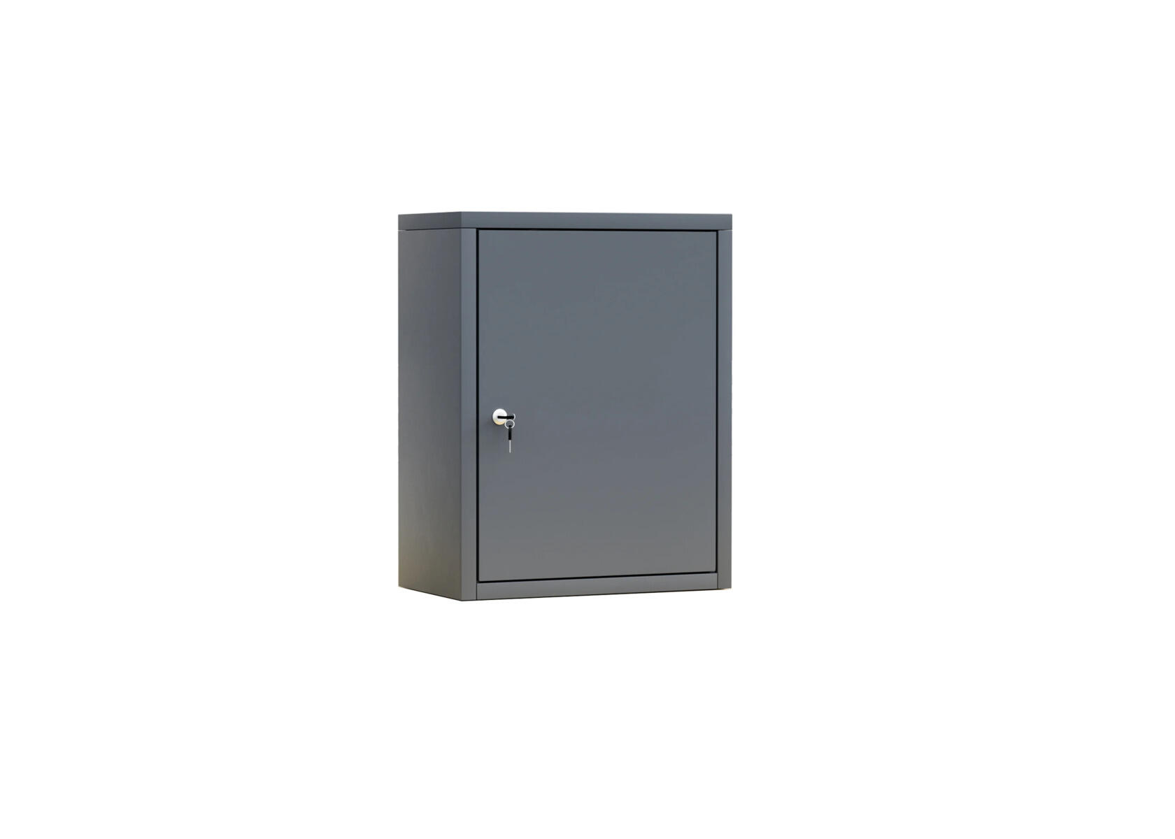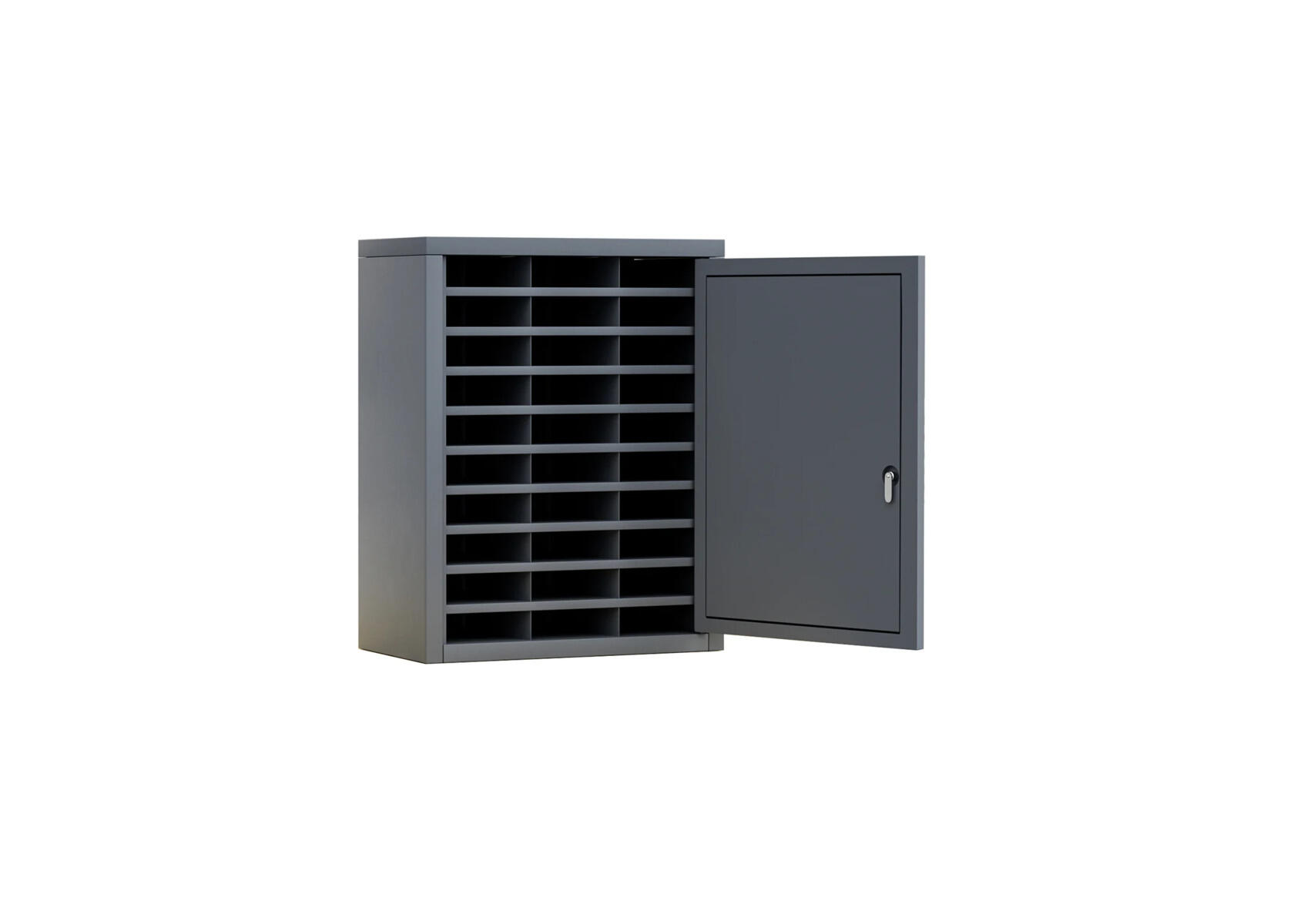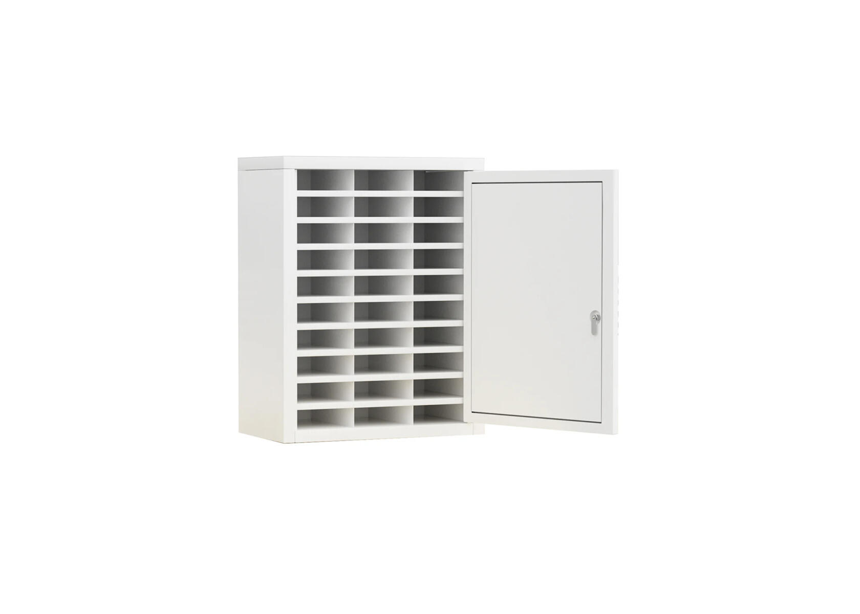 Mobilskap med 30 separate plasser for mobiltelefoner. Skapet har dør med nummererte vinduer og innkast til hvert rom, slik at mobilene kan legges inn selv om døren er stengt/låst. Bak hver luke sitter en metallplate som hindrer at noen kan lirke ut en telefon. Hull i hvert rom på baksiden for ladekabler. Innkast: B98xH18 mm. Mål per rom: B120xD180xH70 mm. Produsert i 0,6 mm stål med elektrostatisk pulverlakkering. Nøkkellås, 2 nøkler følger med. For veggmontering, skruer medfølger ikke.