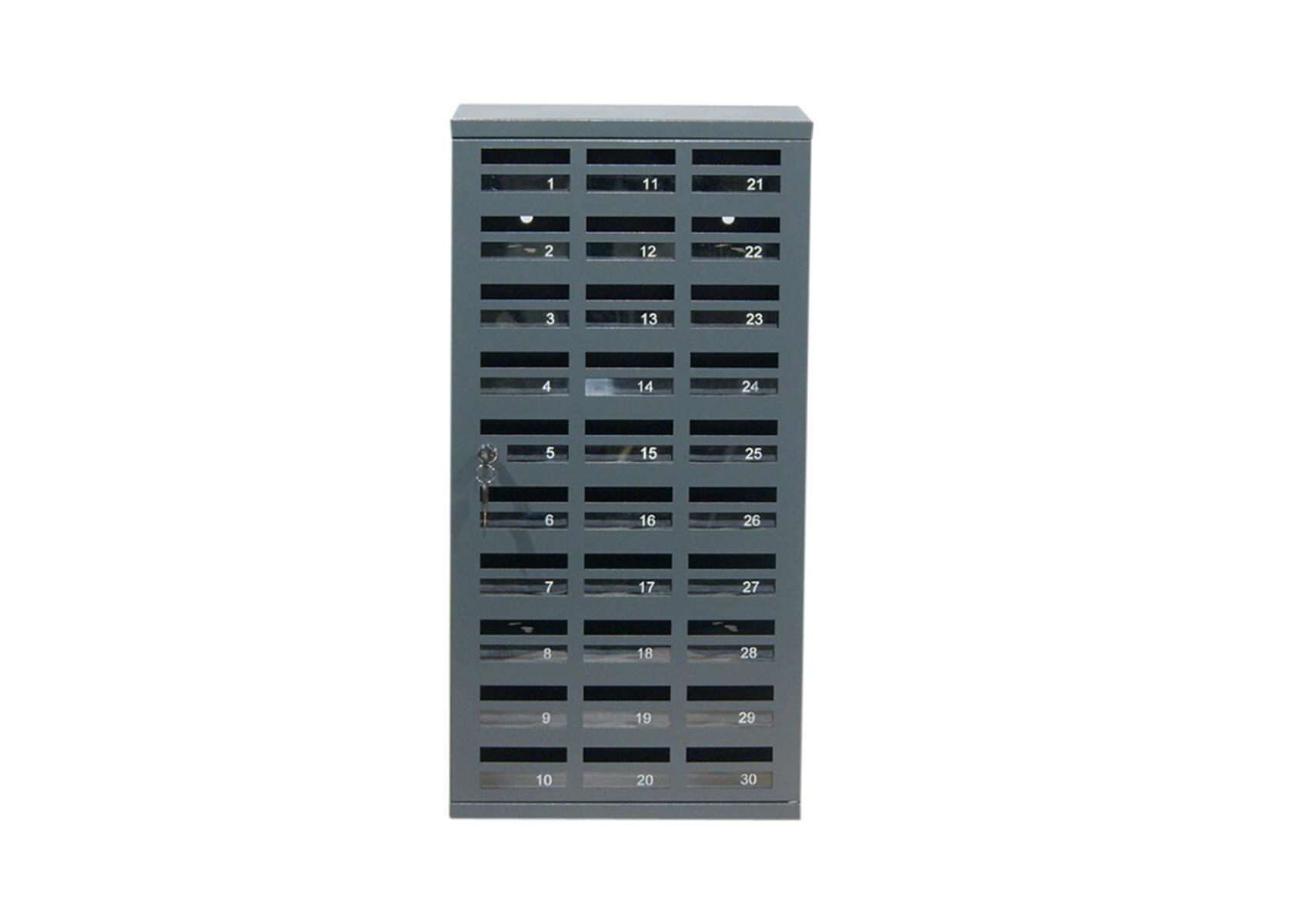 Mobilskap med 30 separate plasser for mobiltelefoner. Skapet har dør med nummererte vinduer og innkast til hvert rom, slik at mobilene kan legges inn selv om døren er stengt/låst. Bak hver luke sitter en metallplate som hindrer at noen kan lirke ut en telefon. Hull i hvert rom på baksiden for ladekabler. Innkast: B98xH18 mm. Mål per rom: B120xD180xH70 mm. Produsert i 0,6 mm stål med elektrostatisk pulverlakkering. Nøkkellås, 2 nøkler følger med. For veggmontering, skruer medfølger ikke.