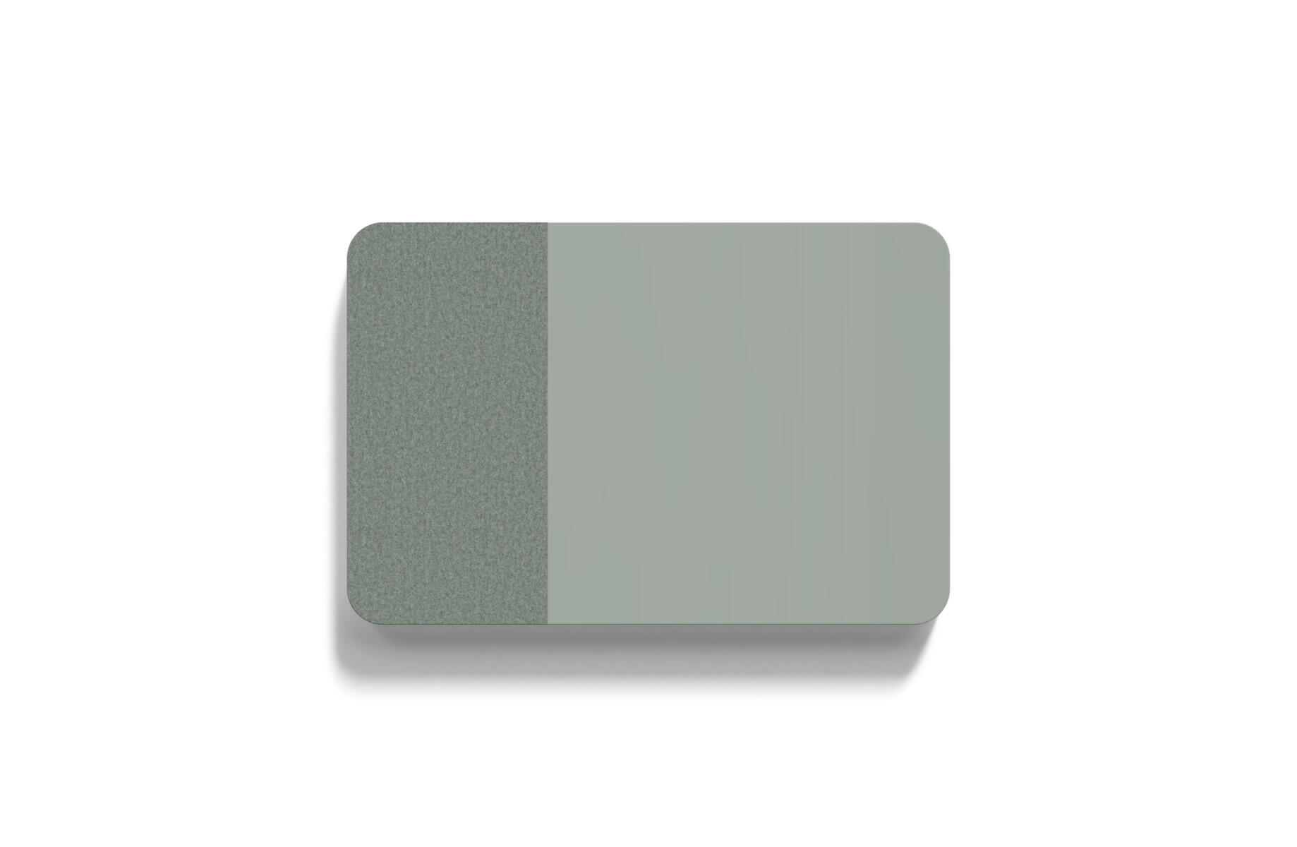 Tavle med kombinasjon av stoffkledd flate og magnetisk skirvbar glassflate samt lydabsorberende fyll. Den stoffkledde flaten er 50 cm bred. Skjulte beslag