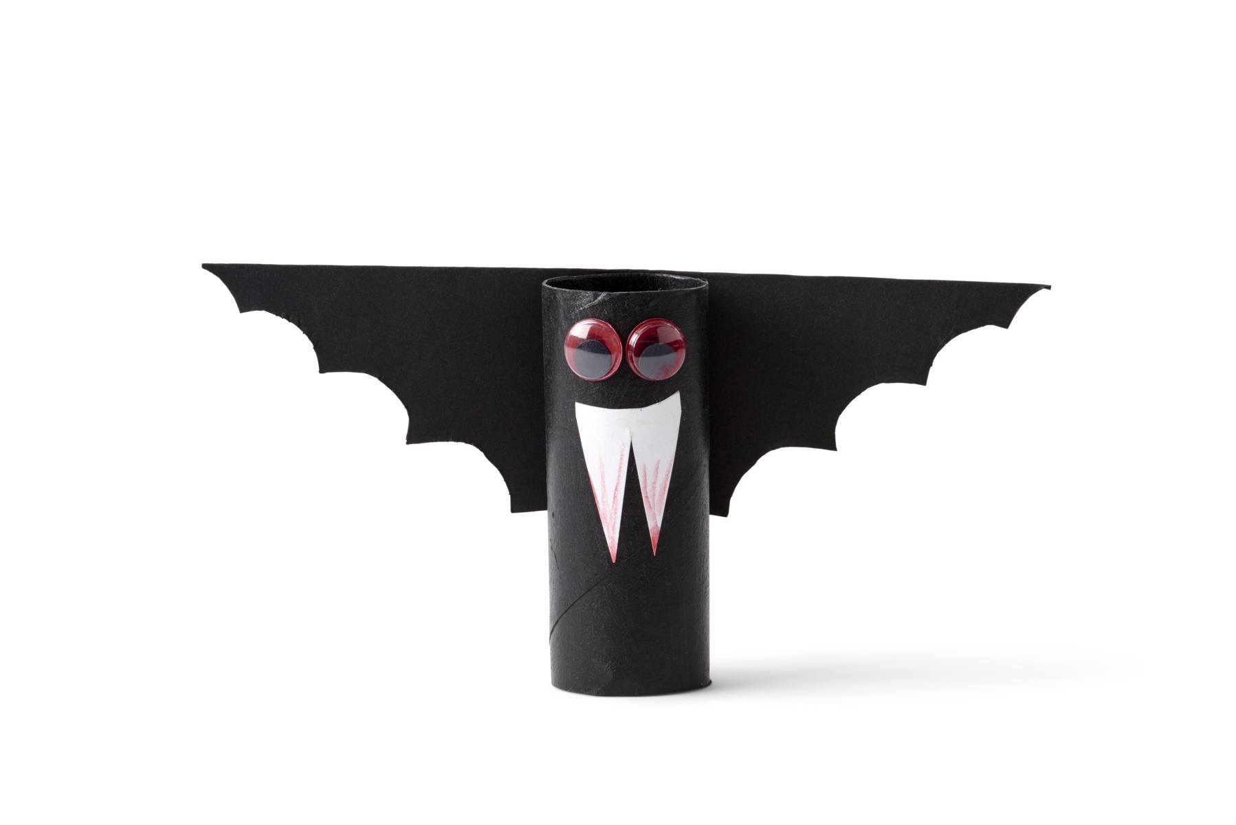 Mal papprullen svart. Klipp ut vinger av svart papp. Klipp ut tenner og lim på papprullen Lim øyne på flaggermusen.