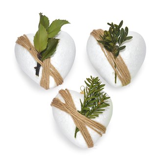 Fest en opphengsring i toppen av hjertet. Surr hampetråd rundt hjertet og fest enden på baksiden. Pynt hjertet med granbar eller annet grønt fra naturen.