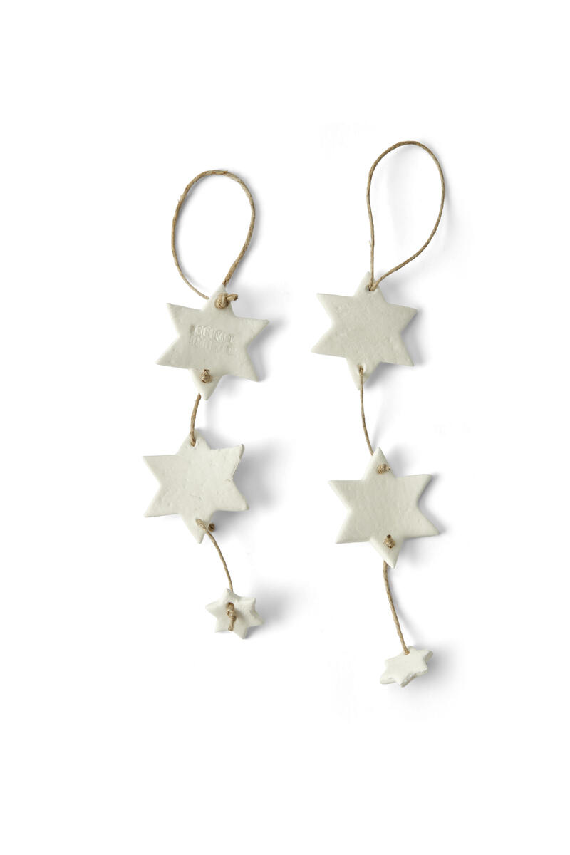 Kjevle leiren flat og trykk ut stjernen. Trykk bokstavstempler i leiren til ønsket ord. Lag hull øverst og nederst som vist på bildet. Tre garn gjennom hullene og heng opp som vist på bildet.