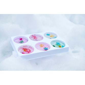 Fyll en plastpalett med f.eks. glitter, paljetter, små Puffypoms e.l. Fyll deretter paletten opp med vatten. Kok gjerne vannet først for klarere isbiter. Studer isbitene. Ta de gjerne med inn og se hva som skjer når isen smelter. Lek og læring i samme tips.