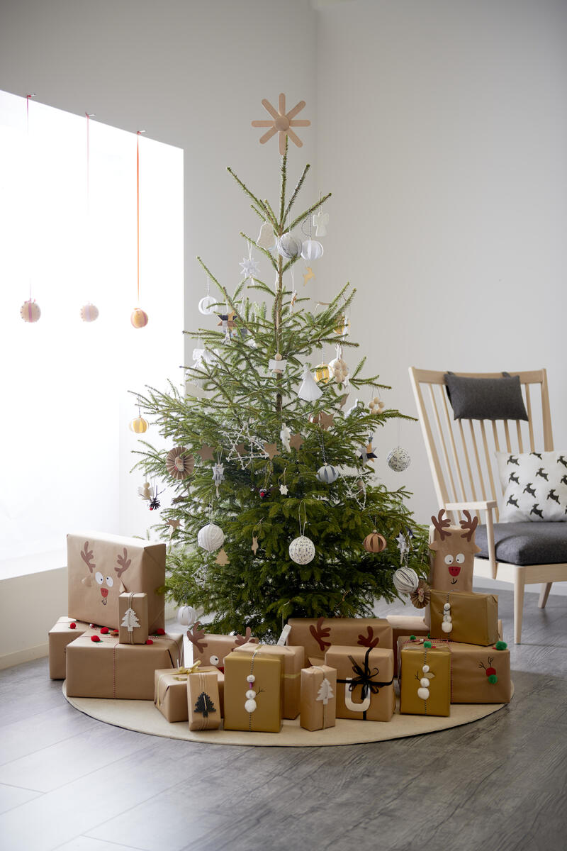 Lim sammen 3 trepinner som en stjerne og lim en knappeform i midten. Lim stjerna i toppen av treet. Bruk gjerne limpistol.