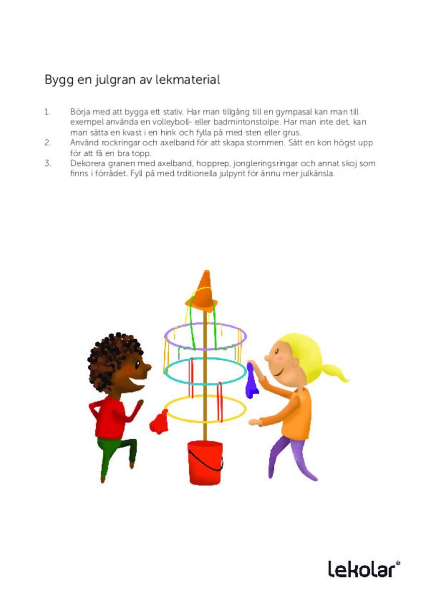 - Pynt treet med lagbånd, hoppetau, sjongleringsskjerf, sjongleringsringer og annet morsomt. Fyll gjerne på med tradisjonell julepynt for enda mer julestemning.