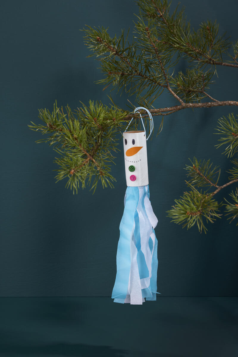 6. Trykk ut hull (gjerne med hulltang) på hver side, og heng opp snømennene med snøre.