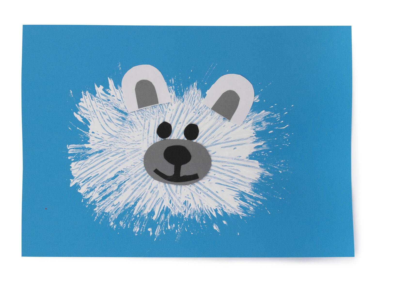 Isbjørn: Legg litt hvit maling på arket. Dra malingen ut med gaffel. Klipp ut munn, nese, øyne og øre i papir. Lim på delene.