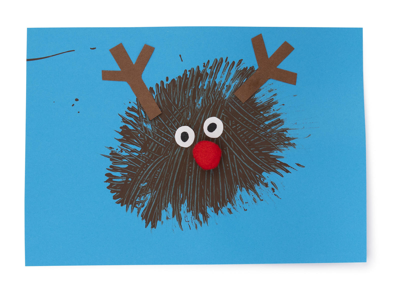 Reinsdyr: Legg litt brun maling på arket. Dra malingen ut med gaffel. Klipp ut øyne og horn i papir. Bruk en PuffyPom som nese. Lim på delene.