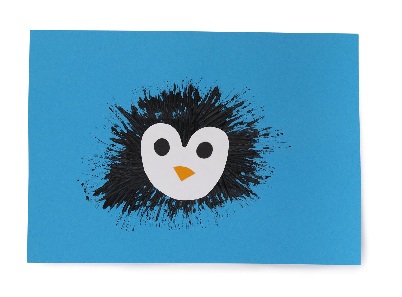 Pingvin: Legg litt svart maling på arket. Dra malingen ut med gaffel. Klipp ut ansikt, øyne og munn i papir. Lim på delene.