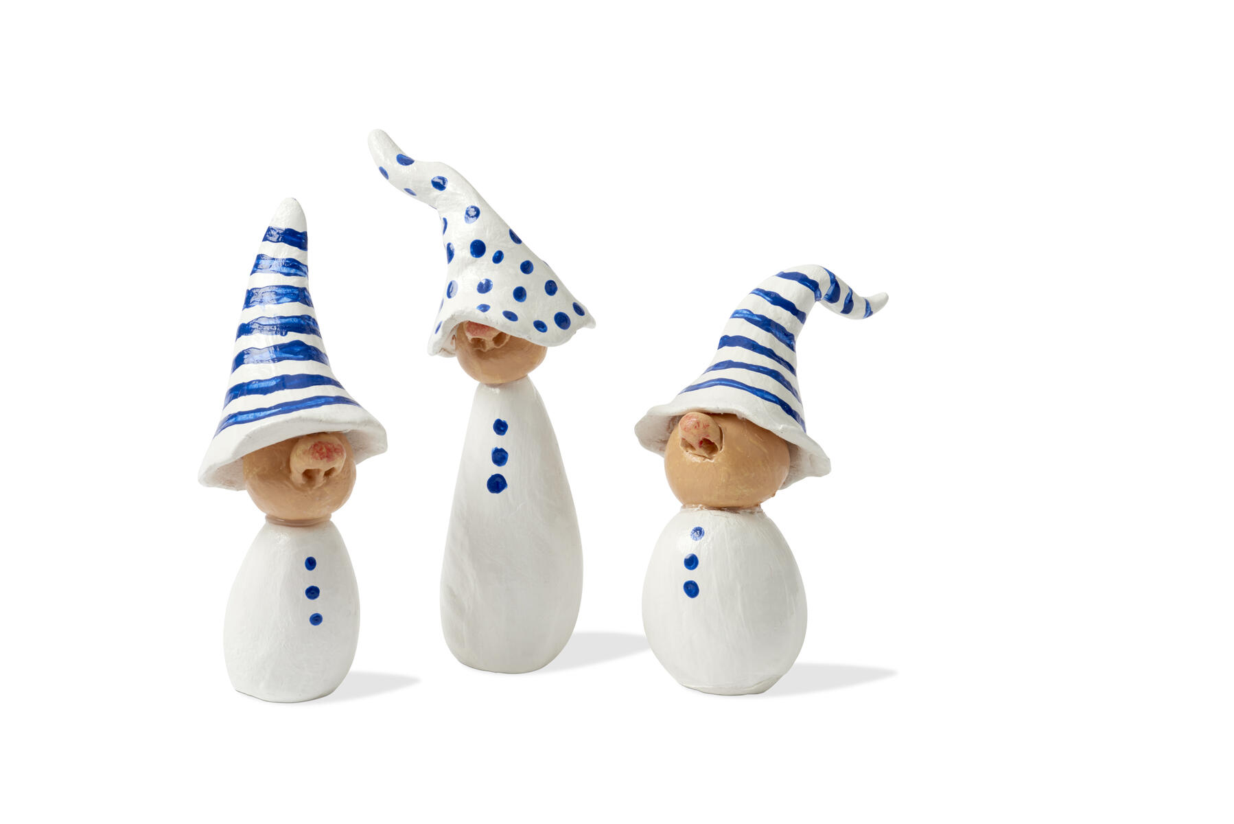 Form nisser av leiren. Form kropp, hatt, ansikt og nese for seg selv. La leiren tørke. Tegn/mal detaljer på nissene. Lim sammen delene.