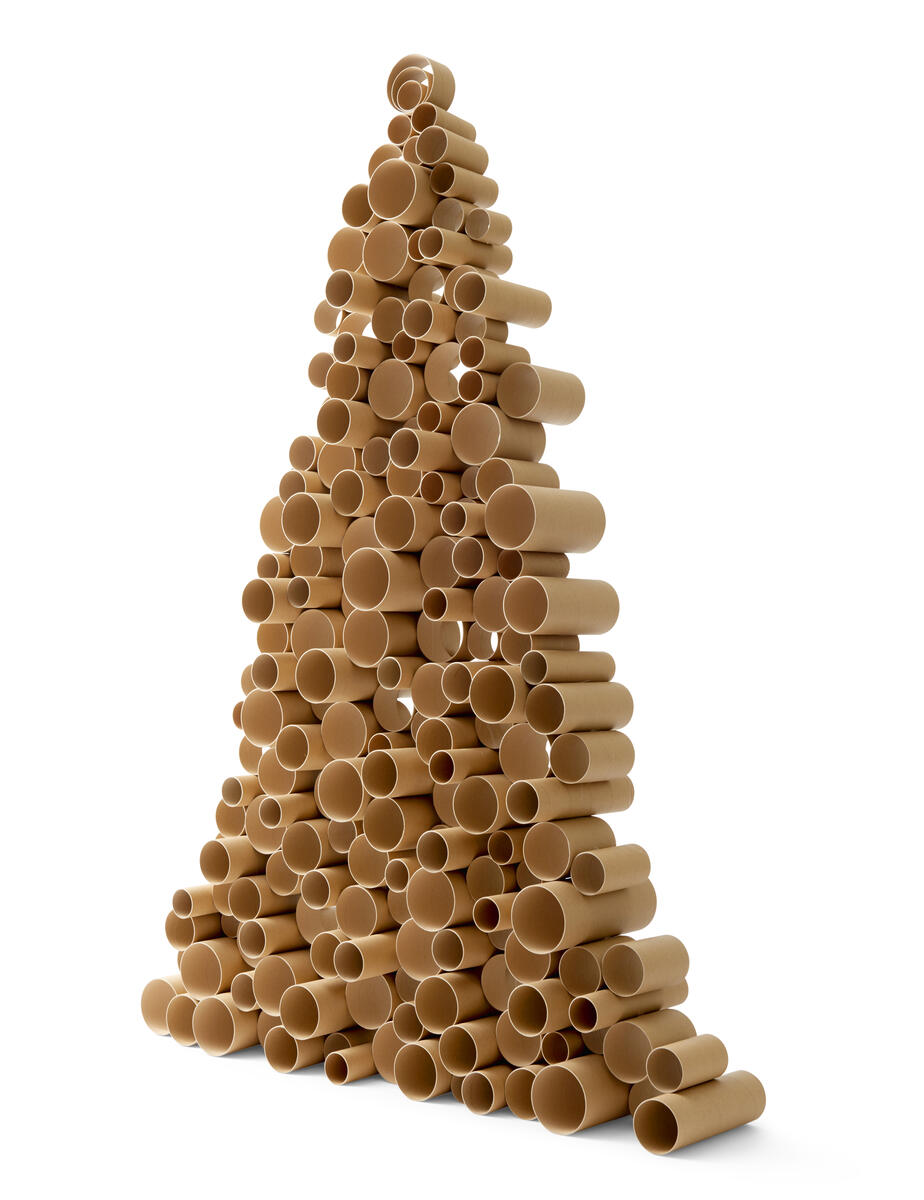 Lim pappruller/doruller på hverandre i juletreform.
