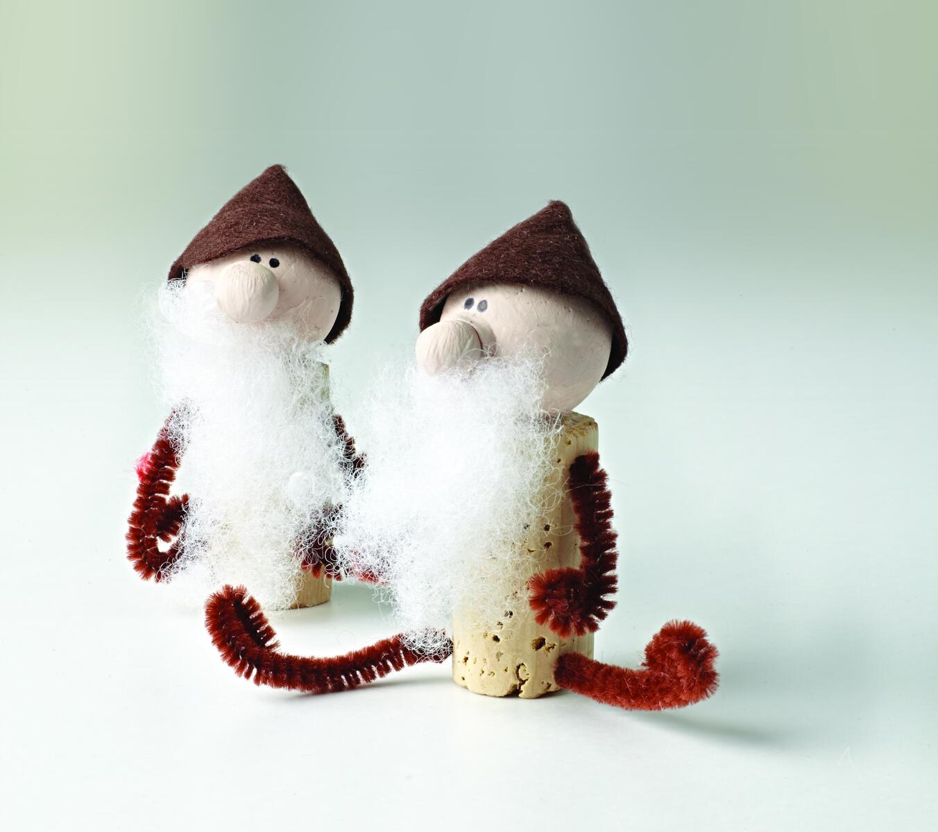 Klipp piperenseren i 4 deler til bein og armer. Lim den store vattkulen fast på korkbiten, lim deretter den lille vattkulen på den store. La det tørke. Mal med Shine. Når det har tørket, limer du fast soft-fill som blir til skjegg. Trykk piperenserne godt inn i korken. Klipp til en lue av dekorasjonsfilten.