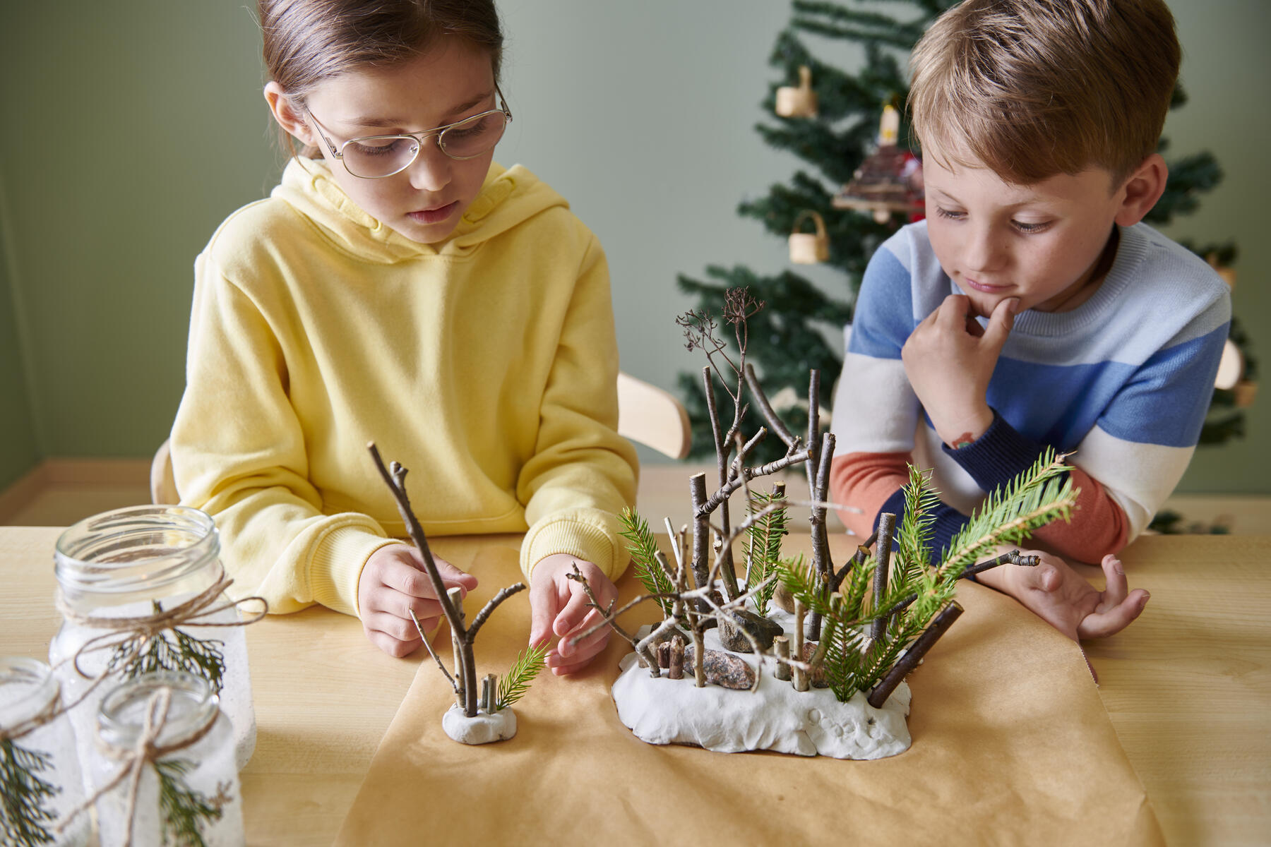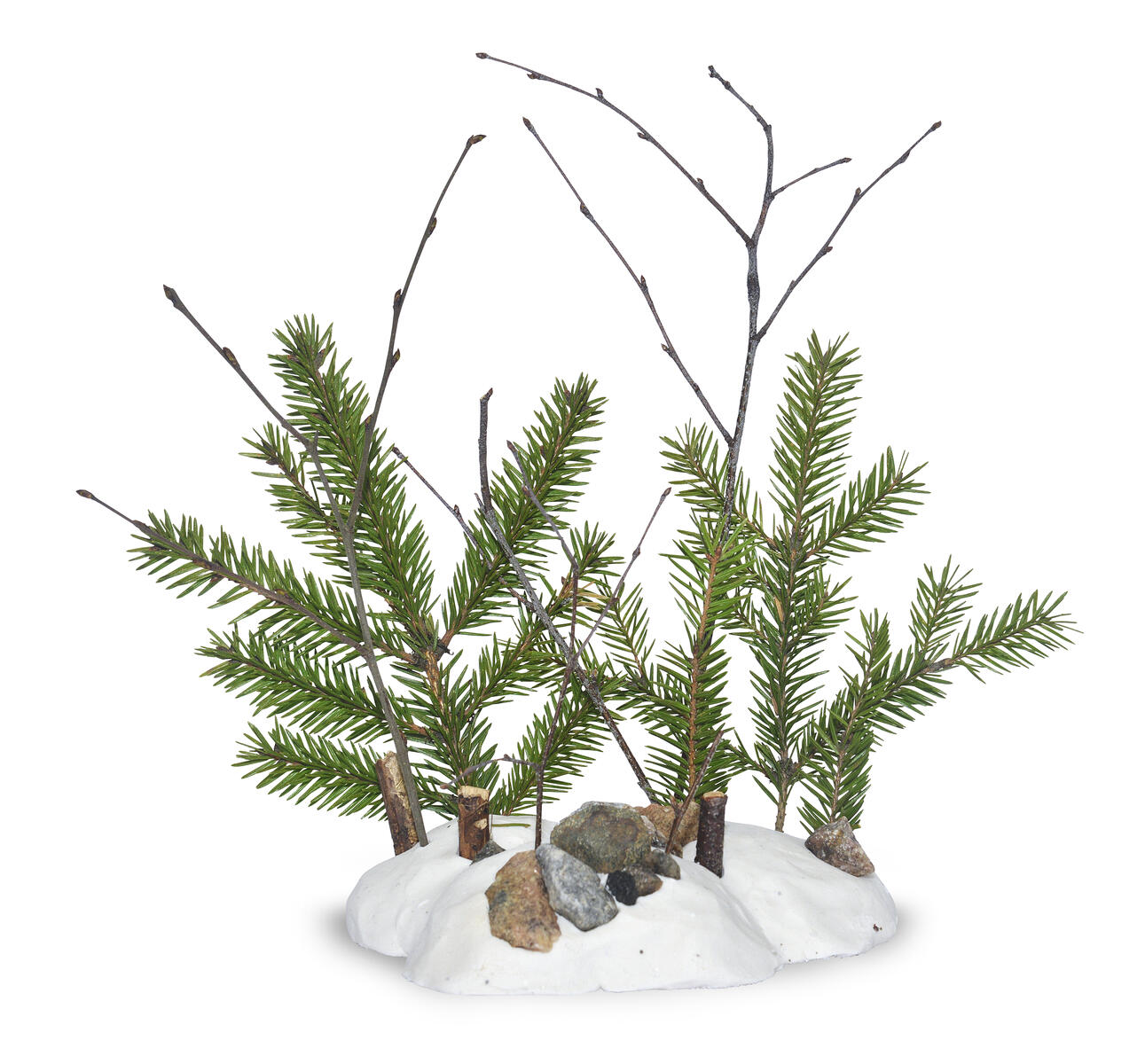 Form leiren til en liten forhøyning/bakke. Gå ut og finn greiner, steiner, kongler m.m. Trykk de ned i leiren og lag en liten skog. Vi har satt det lengste bakerst og jobbet oss fremover.