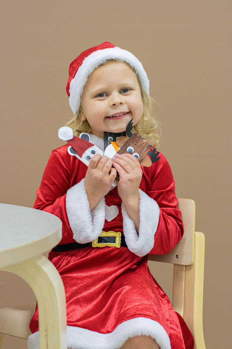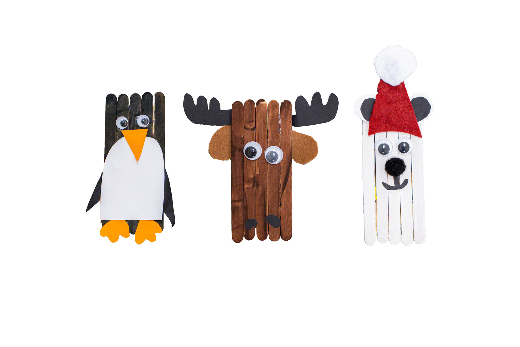 3. Klipp ut deler av papir og filt, og lim på som vist på bildet. Isbjørnen har fått en PuffyPom som nese.