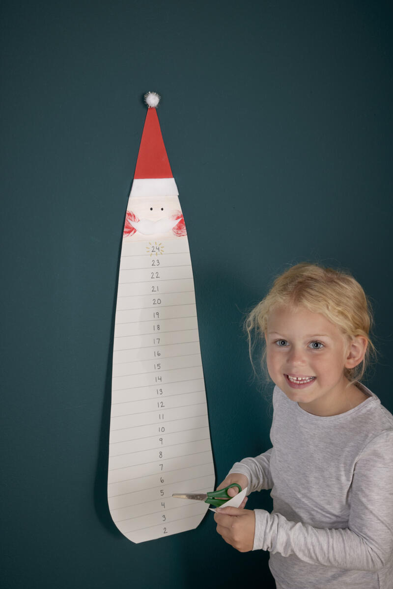 Heng julekalenderen opp i toppen slik at det er lett å klippe av en bit for hver dag.
