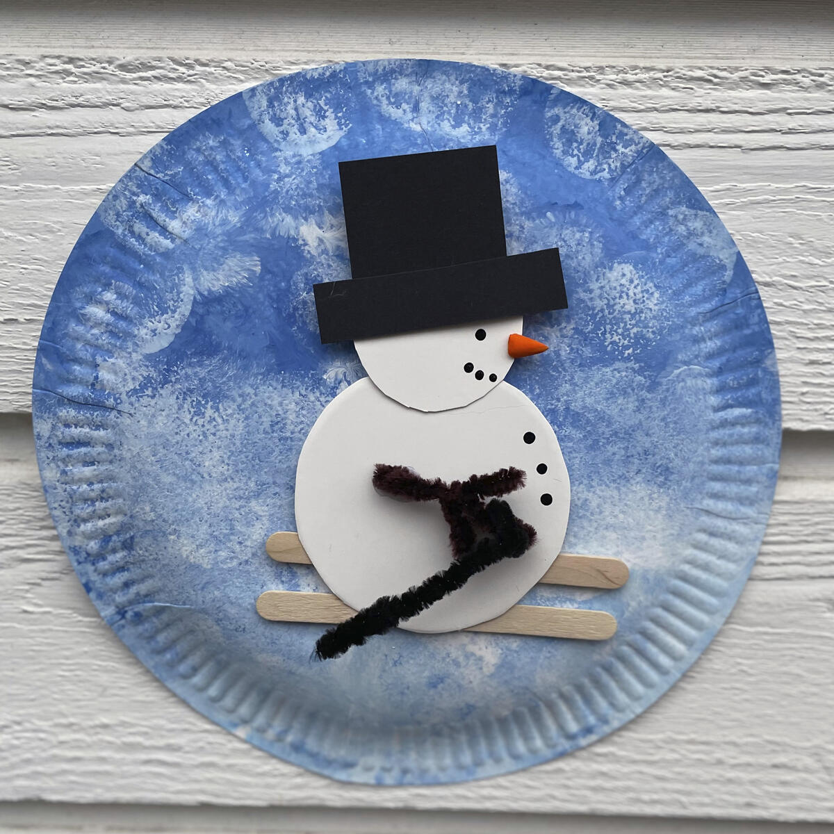 - Mal himmelen blå og snøen hvit med svamper. Lag en myk overgang mellom fargene på midten av papptallerkenen. La tørke.
