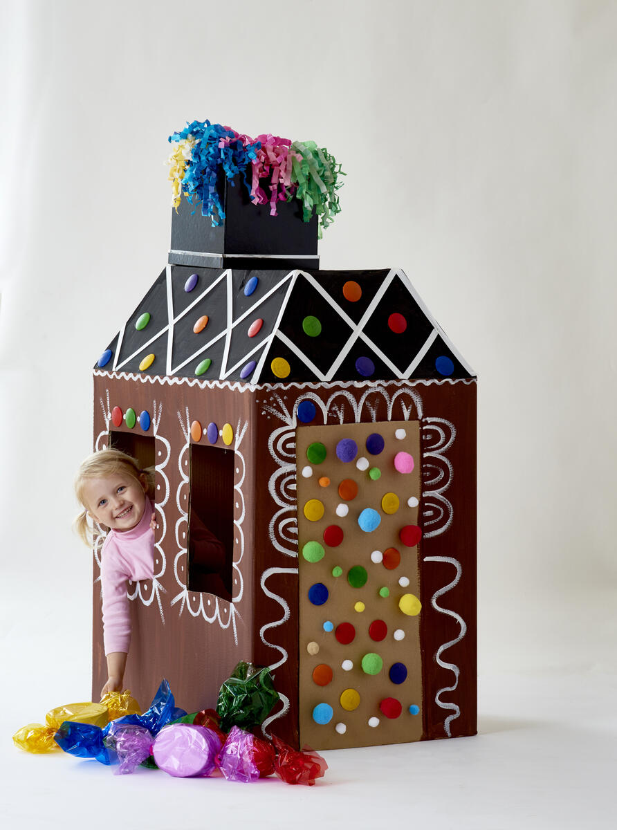 Huset er laget av bred bølgepapp malt med brun Readymix-maling.